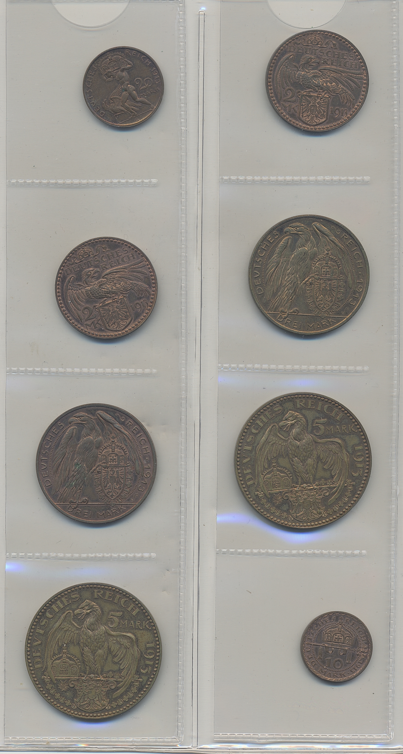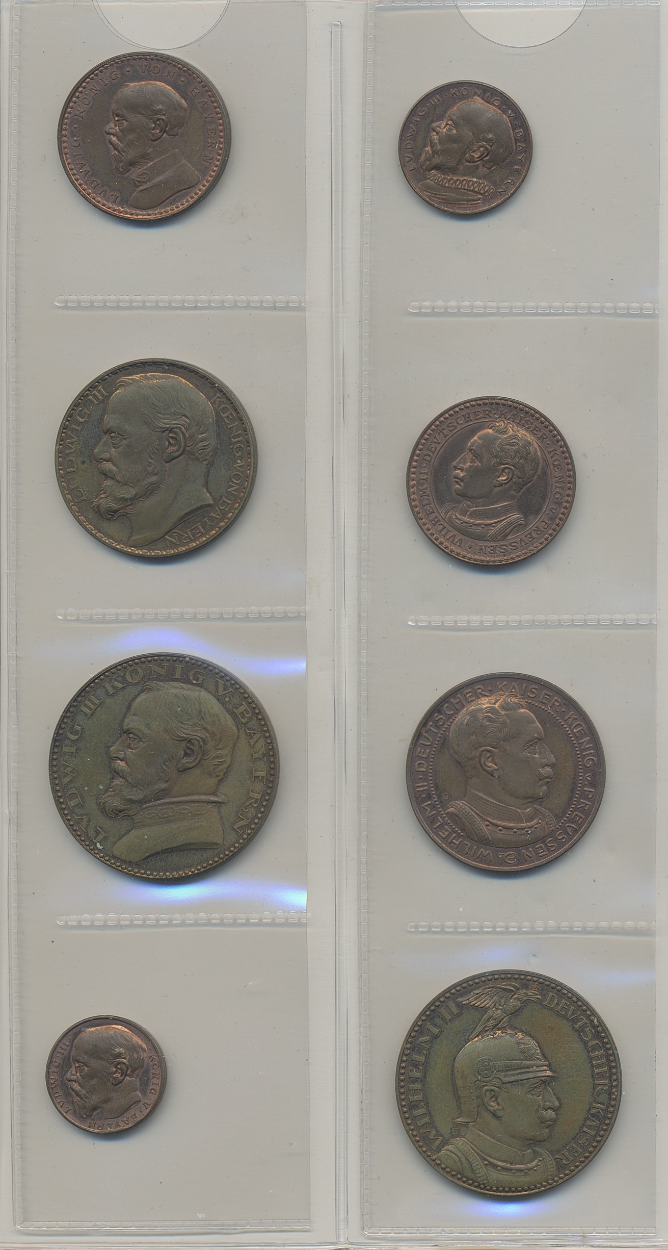 Coins, Germany, Weimar Republic. Group of eight different copper patterns 1913 including five coins from Bavaria (2, 3, 5, 10 and 20 mark) and three from Prussia (2, 3, 5 mark). Some with light PVC or verdigris. Please inspect! XF-UNC.
