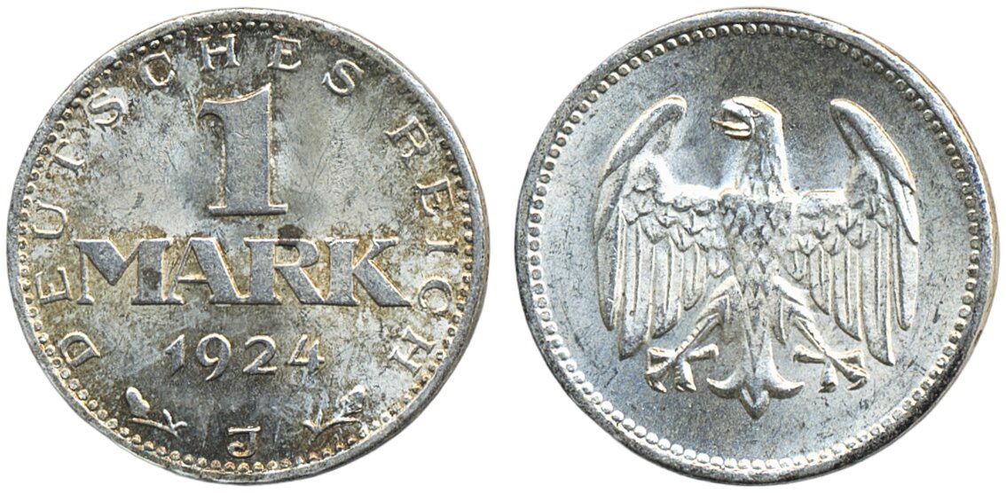 Coins, Germany, Reich. KM 42, 1 mark 1924 J. Jaeger 311. XF-UNC.