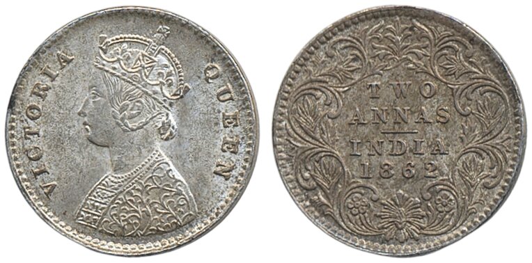 Coins, India. Queen Victoria (1837-1901), KM 469, 2 annas 1862. XF-UNC.