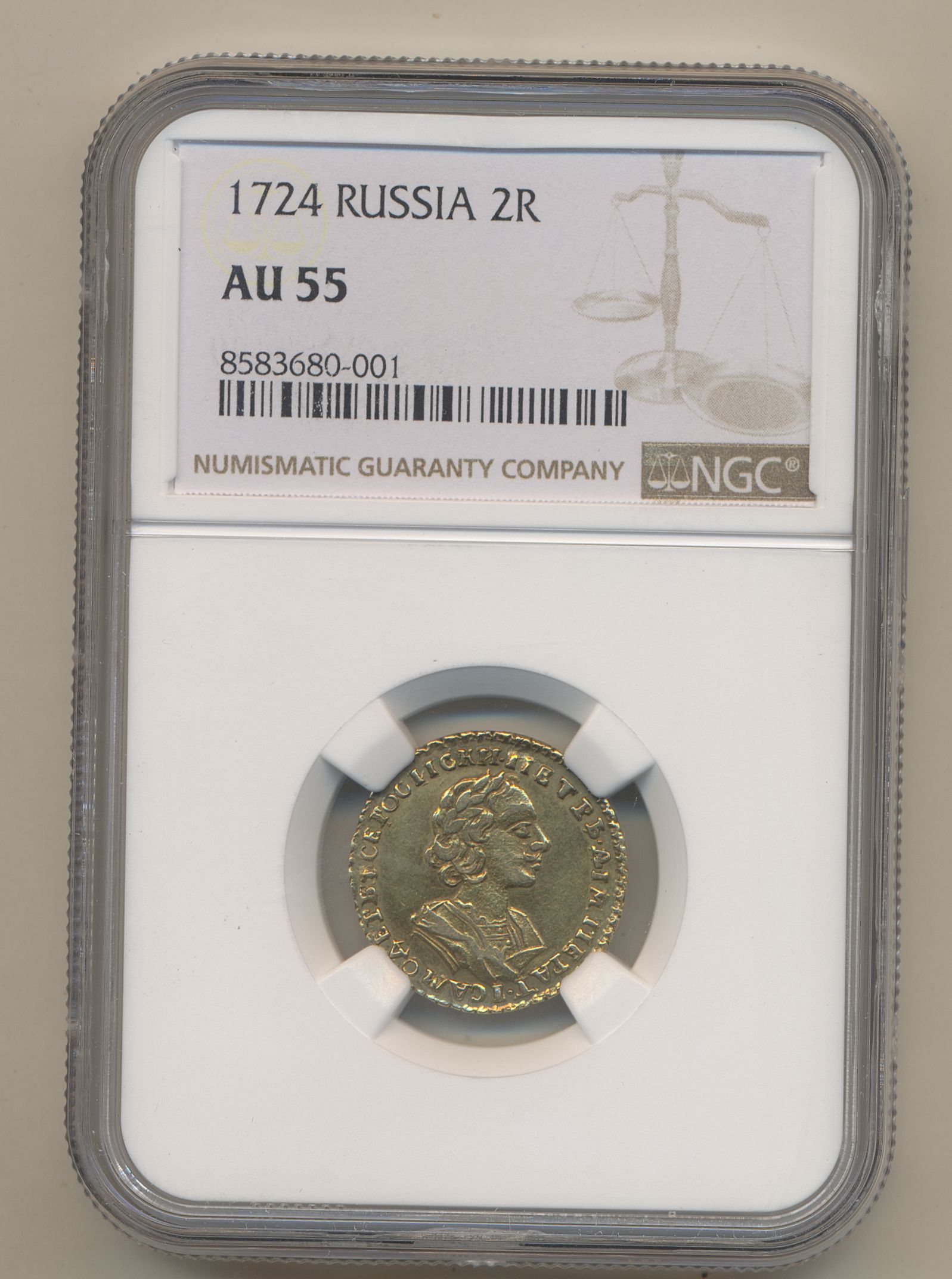 Coins, Russia. Peter I (The Great), Bitkin 163 (R), 2 roubles 1724. Beautiful lustrous example of this scarce type. Graded by NGC as AU55. XF. See certification at NGC