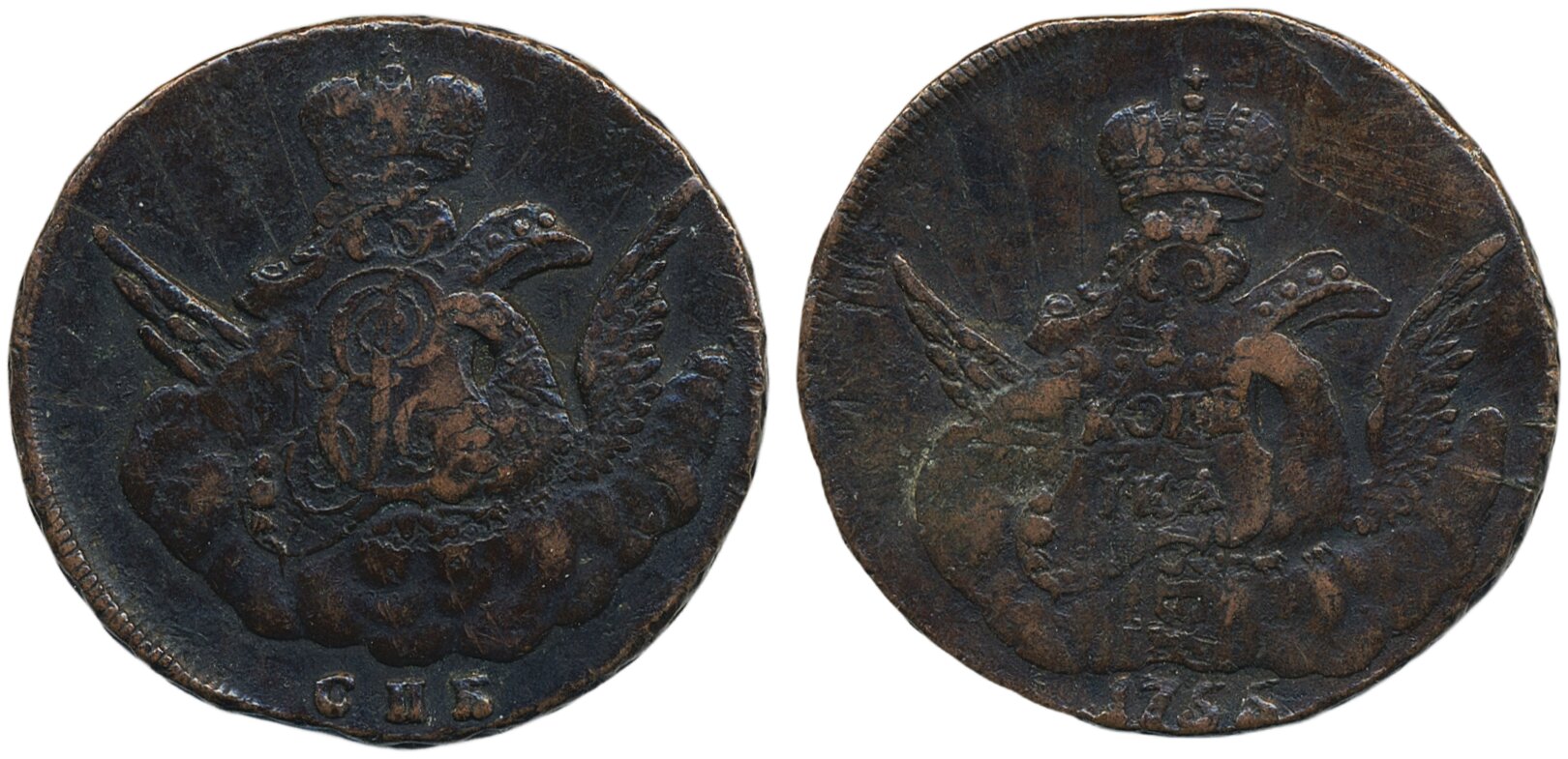 Coins, Russia, Siberia. Elizabeth, Bitkin 532 (R), 1 kopek 1755. 21.45 g. Overstruck on Peter II type 5 kopeks. VF.