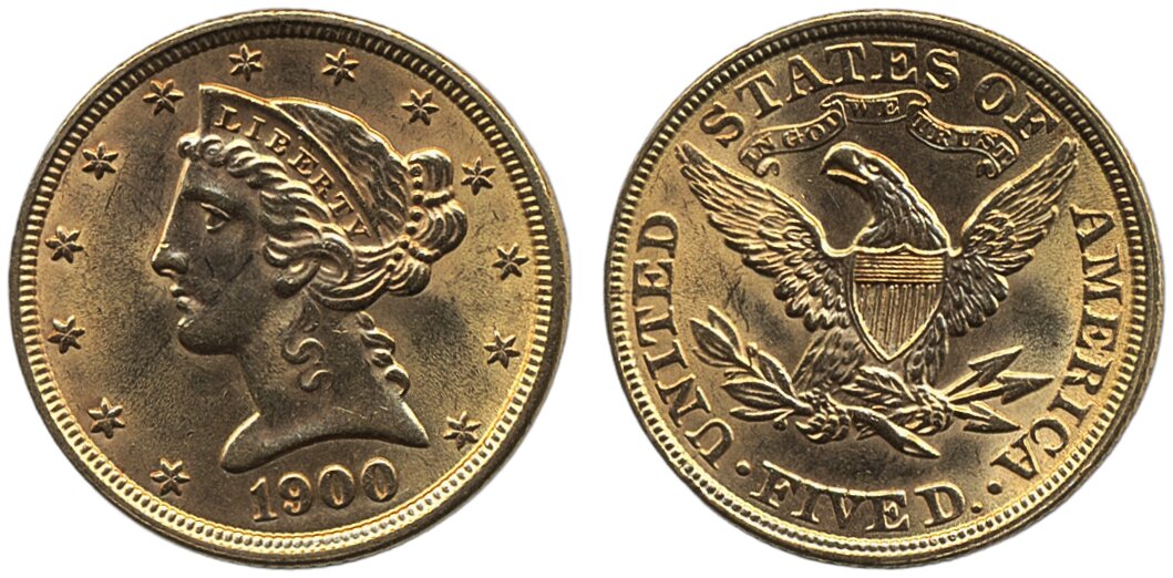 Coins, U.S.A. KM 101, 5 dollars 1900. 8.33 g. gold, Cornet Head. XF.