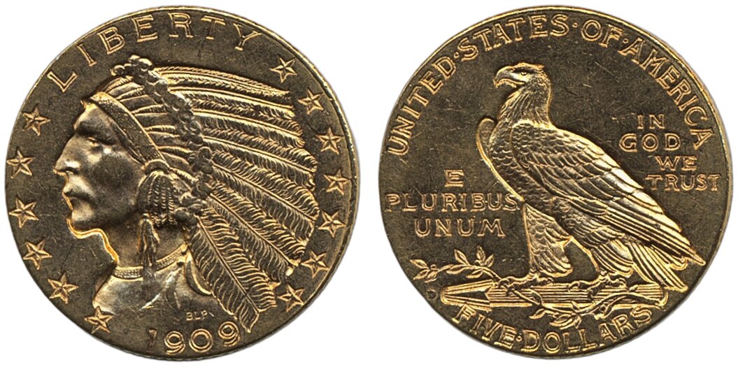 Coins, U.S.A. KM 129, 5 dollars 1909. 8.33 g. gold, Half Eagle.D. XF.