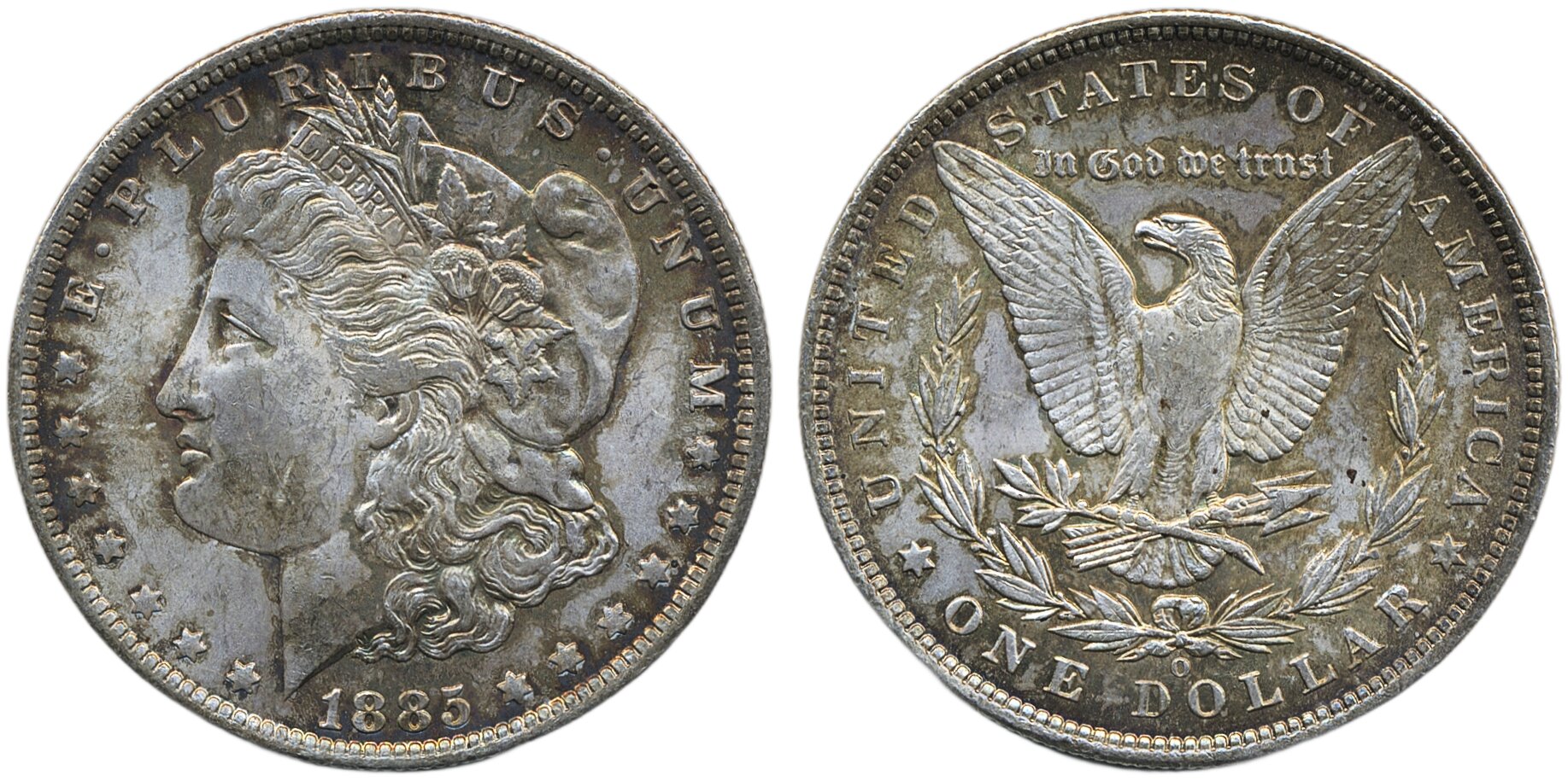 Coins, U.S.A. KM 110, 1 dollar 1885 O. Beautiful example with rainbow toning. UNC.