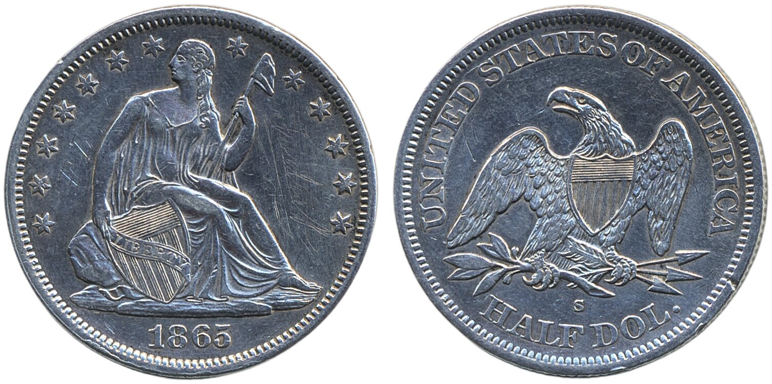 Coins, U.S.A. KM 79, ½ dollar 1865 S. Cleaned, tooled. F-VF.