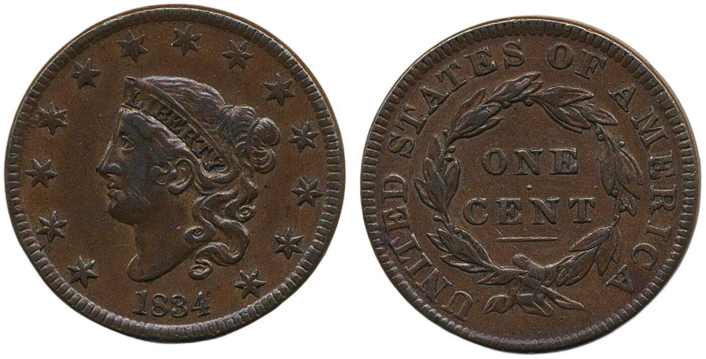 Coins, U.S.A. KM 45, 1 cent 1834. VF-XF.