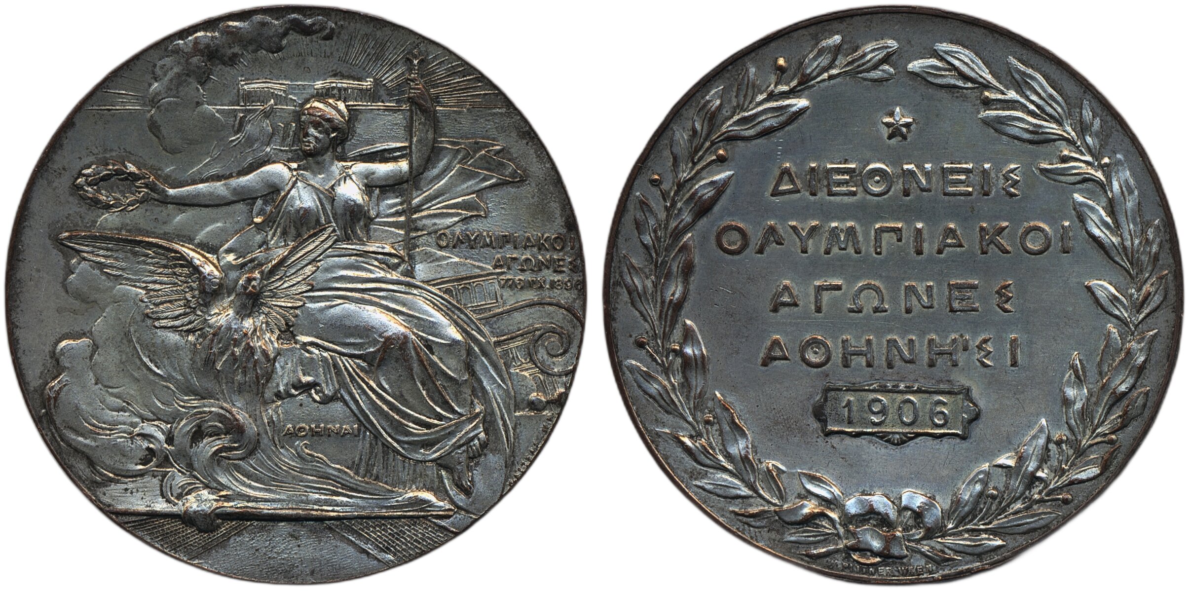 Medals, non-regal, Greece. Gadoury 2, Medal in silvered bronze to Extraordinary Olympics in Athens 1906. 58.86 g, 50 mm. Personification of Victory on obverse. Designed by N. Lytras and W. Pittner. XF.