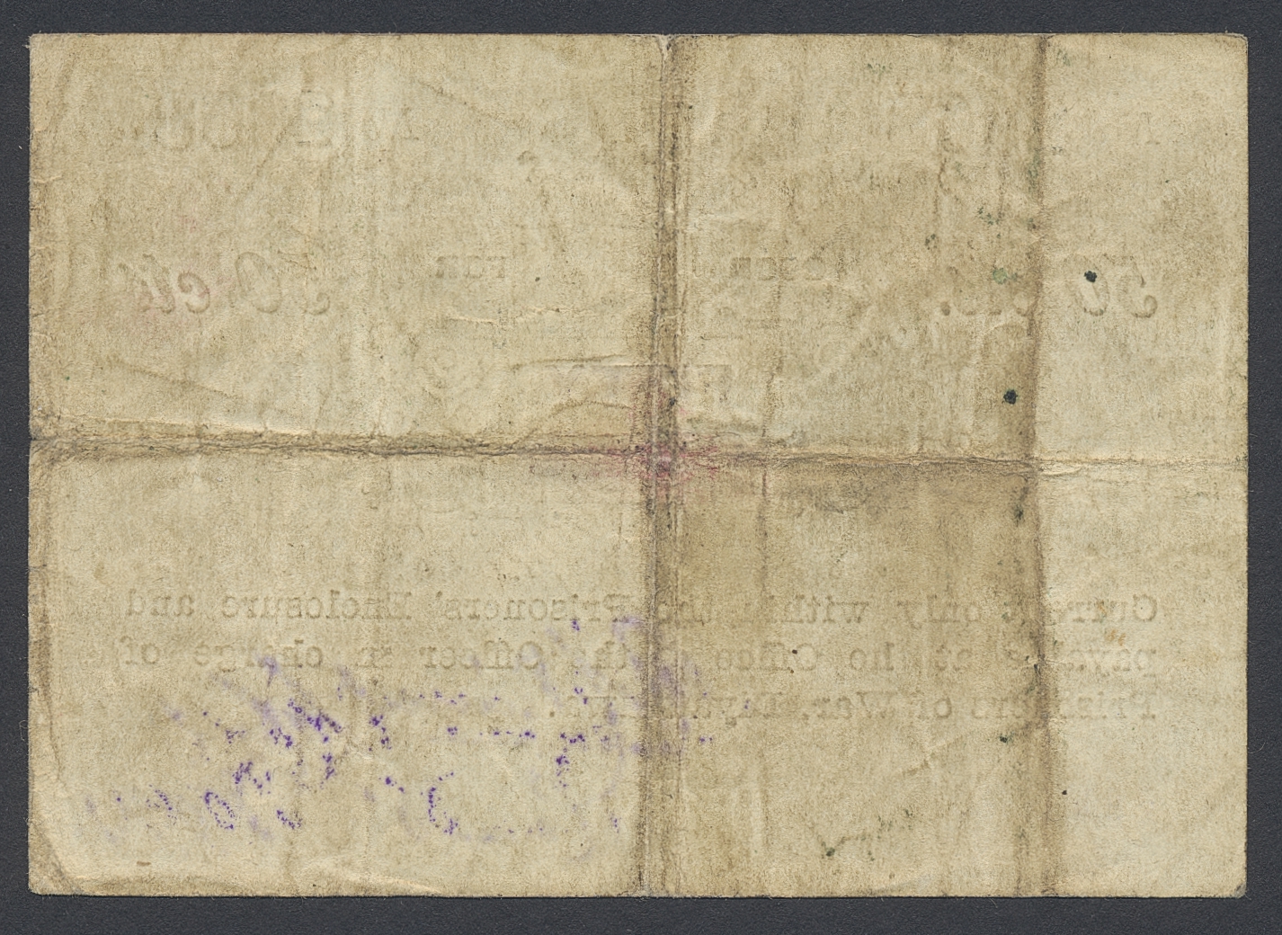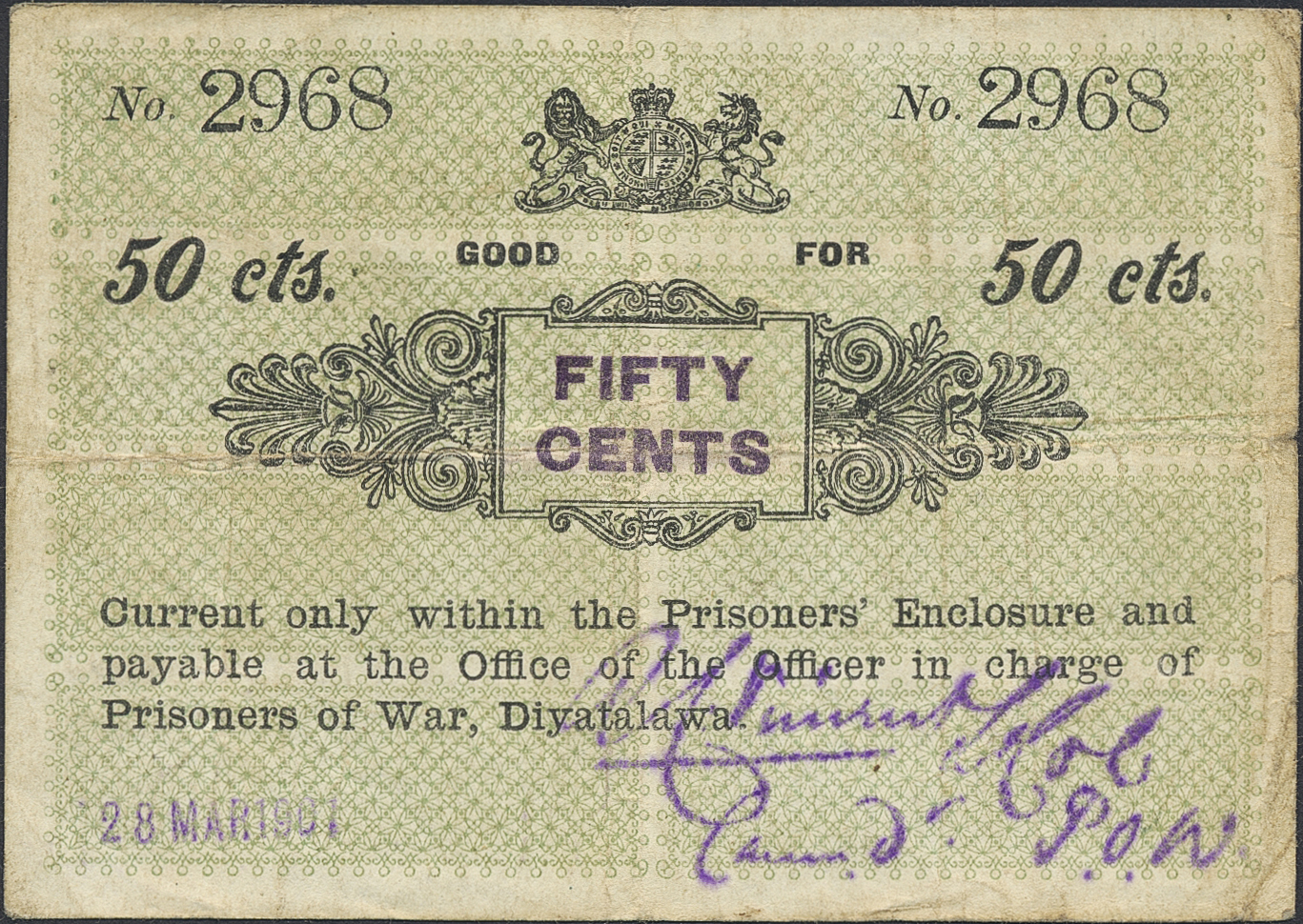 Banknotes, Ceylon, P.O.W. Diyatalawa Camp. Ineson 205, 50 cents 28 MAR 1901. No 2968. During Boer War there were several overseas POW camps including this one in Ceylon. Scarce note. F.