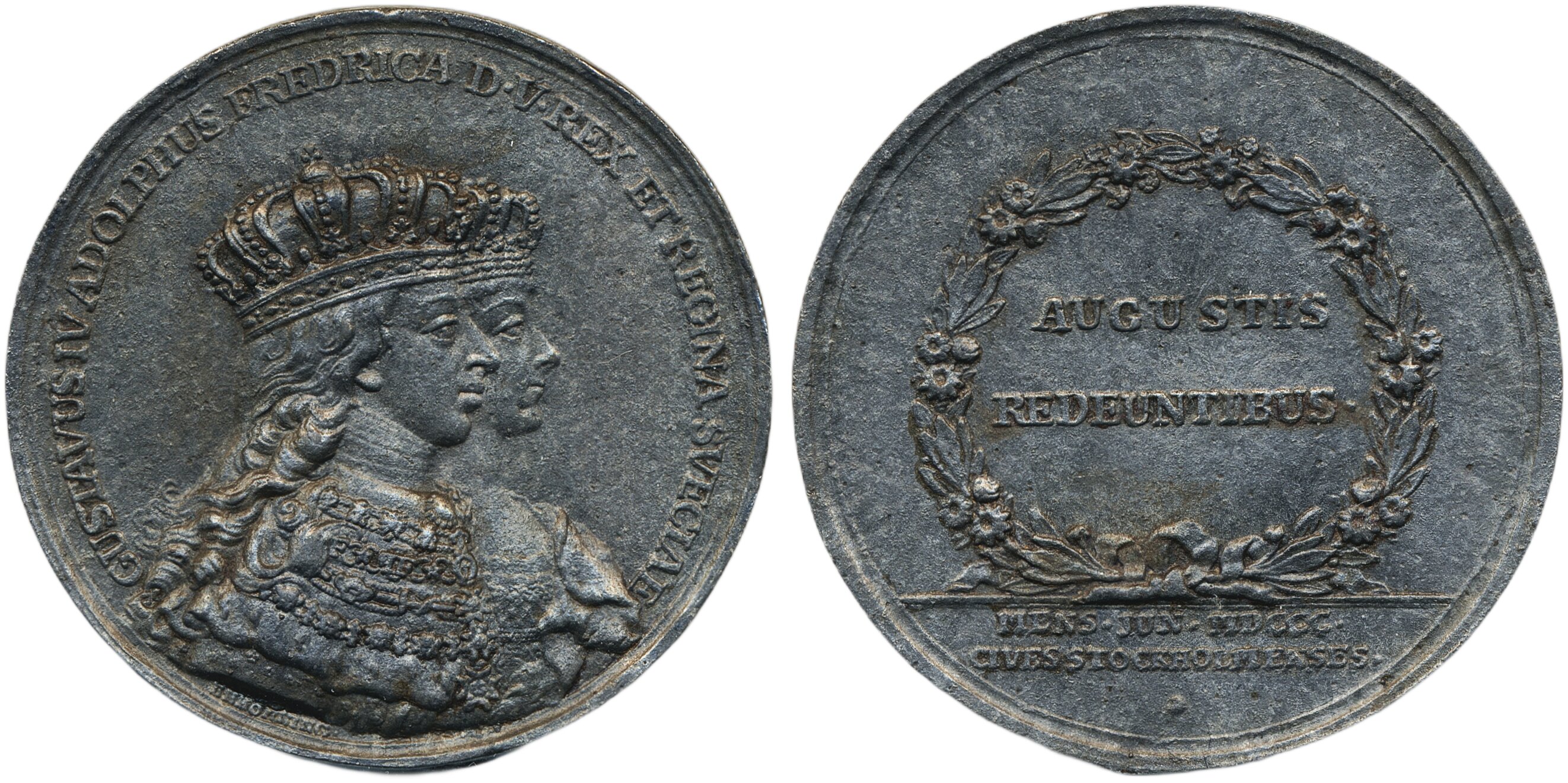 Medals, regal, Sweden. Gustav IV Adolf, Hild. 22, Cast iron/tin medal, 57 mm, 40.78 g. Issued to return to Stockholm of King and Queen from Coronation in Norrköping, 1800, by Carl Enhörning. SKM 25d. 1+/01.