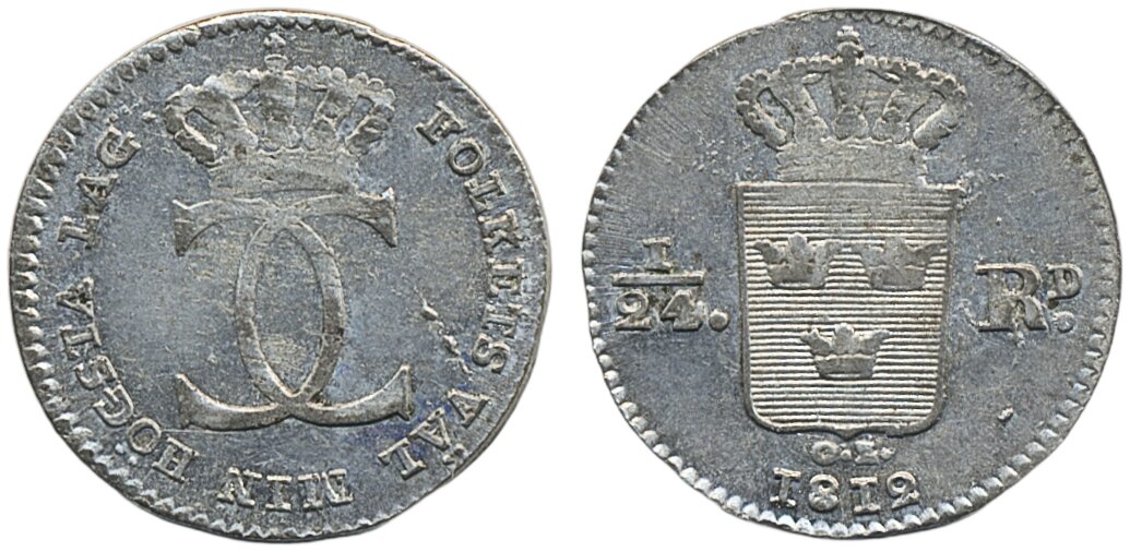 Coins, Sweden. Karl XIII, SM 27, 1/24 riksdaler 1812. 2.91 g. Stockholm. Partly weakly struck. 1+/01.