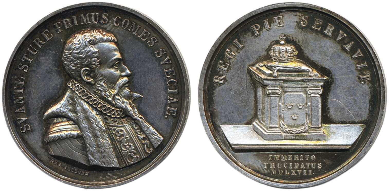 Medals, non-regal, Sweden. Hyckert 1.17, Svante Sture (1517–1567). Lord High Constable (Riksmarsk). Struck for Swedish Academy (Svenska akademien) 1875, by L. Ahlborn. Silver medal, 31 mm, 12.75 g. Lustrous example with reflective surfaces. 01/0.