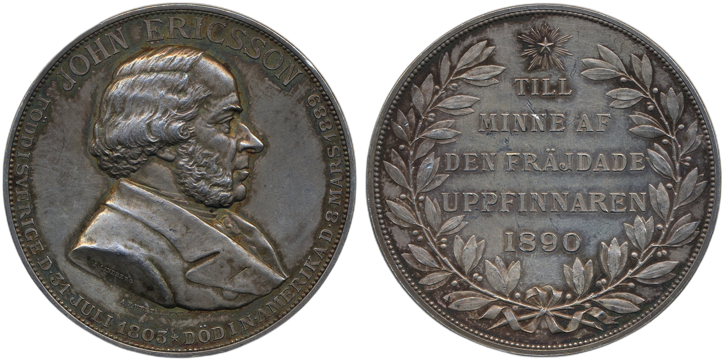 Medals, non-regal, Sweden. Hyckert II:209:2, John Ericsson (1803–1889), inventor. Silver medal, 51 mm, 53.72 g. Engraved by A. Lindberg, struck 1890. Somewhat cleaned. 01.