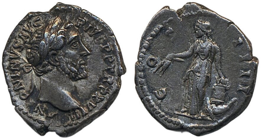 Coins, Ancient, Roman Empire. Antonius Pius (138–161 AD), Sear 4068, 1 denar. 3.63 g. Silver. XF.