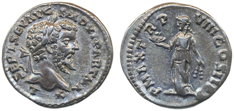 Coins, Ancient, Roman Empire. Septimius Severus (193–211). Denarius, 3.50 g. Laureate head right / Fides standing front, holding basket of fruit and two grain-ears. Splendid portrait! RSC 455. XF.