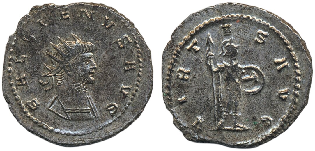 Coins, Ancient, Roman Empire. Gallienos (253–268). Antoninianus, 3.24 g. Antioch. Radiate, cuirassed bust right / Soldier standing right, holding spear and shield. RIC 669. XF.