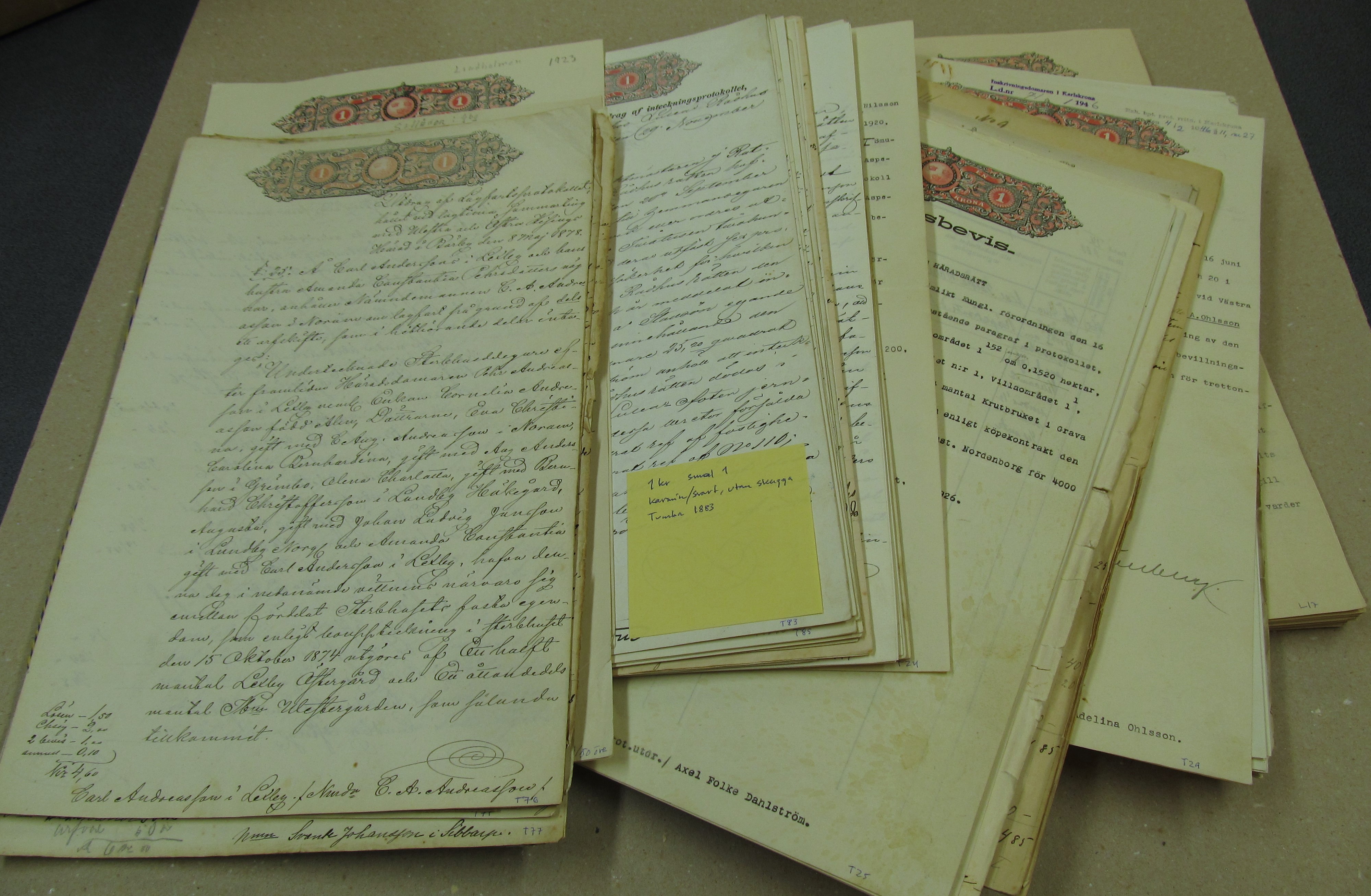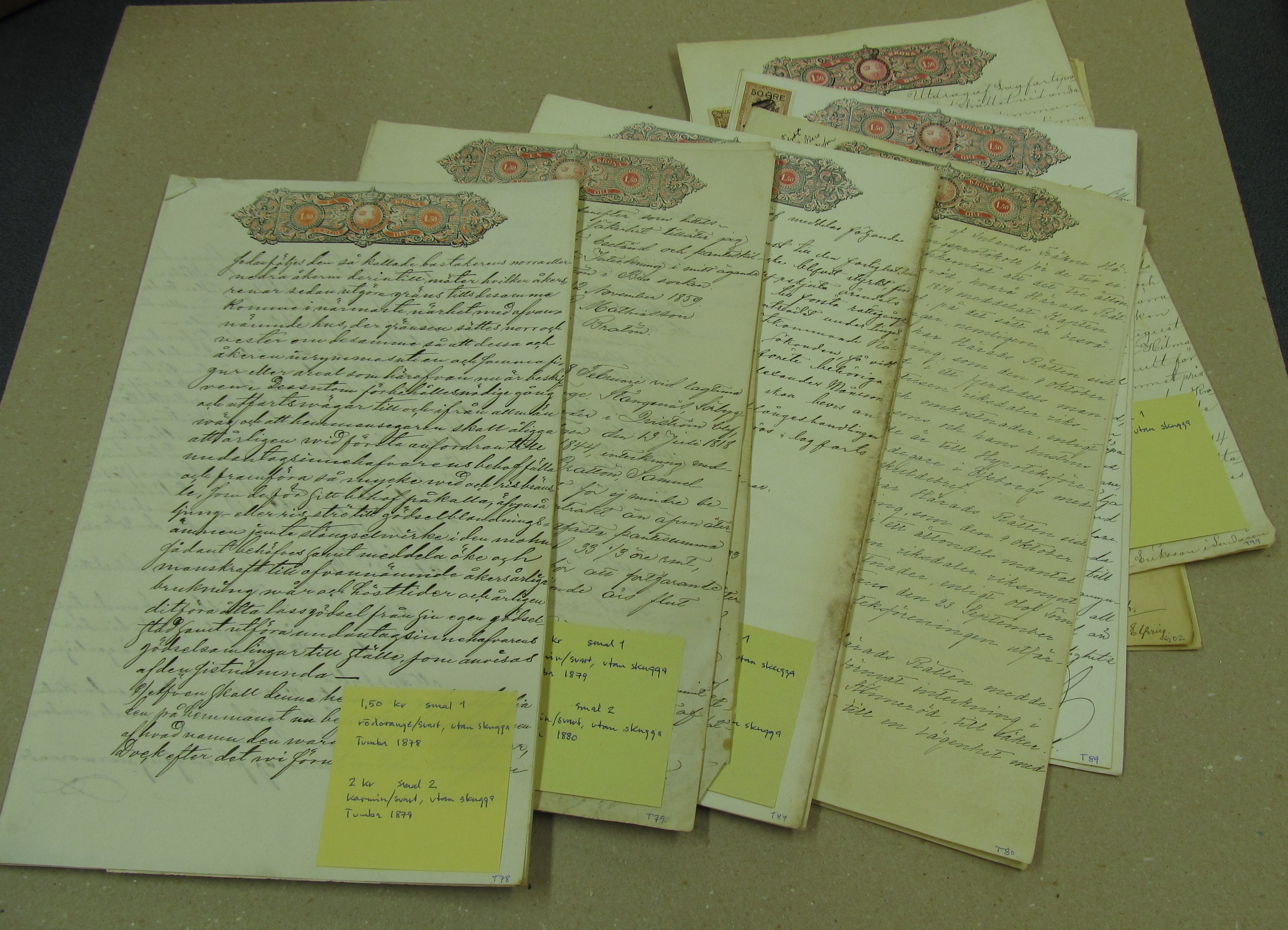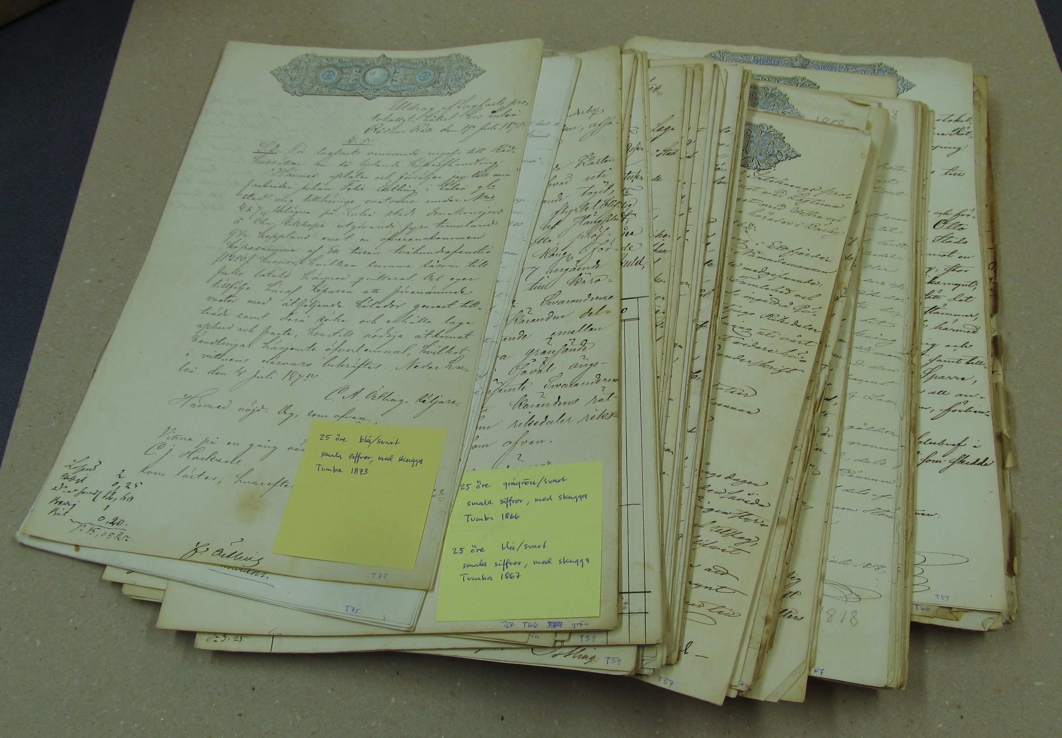 Sweden. Revenue stamped papers, collection/accumulation in box. An extensive and highly specialized compilation of revenue stamped papers from the seventh period (1858–1946). In total 495 documents (a bundle of 19 cm height!) with all denominations from the period, including the rare 75 öre and three 2 kr overprinted on 3 kr. Incl. different paper mills, a great number of different years in watermark, color shades, misprints, various printings, etc. A comprehensive and specialized collection almost impossible to obtain. Condition good to very fine. Some scans are presented at www.philea.se. Approx. 10 kg.