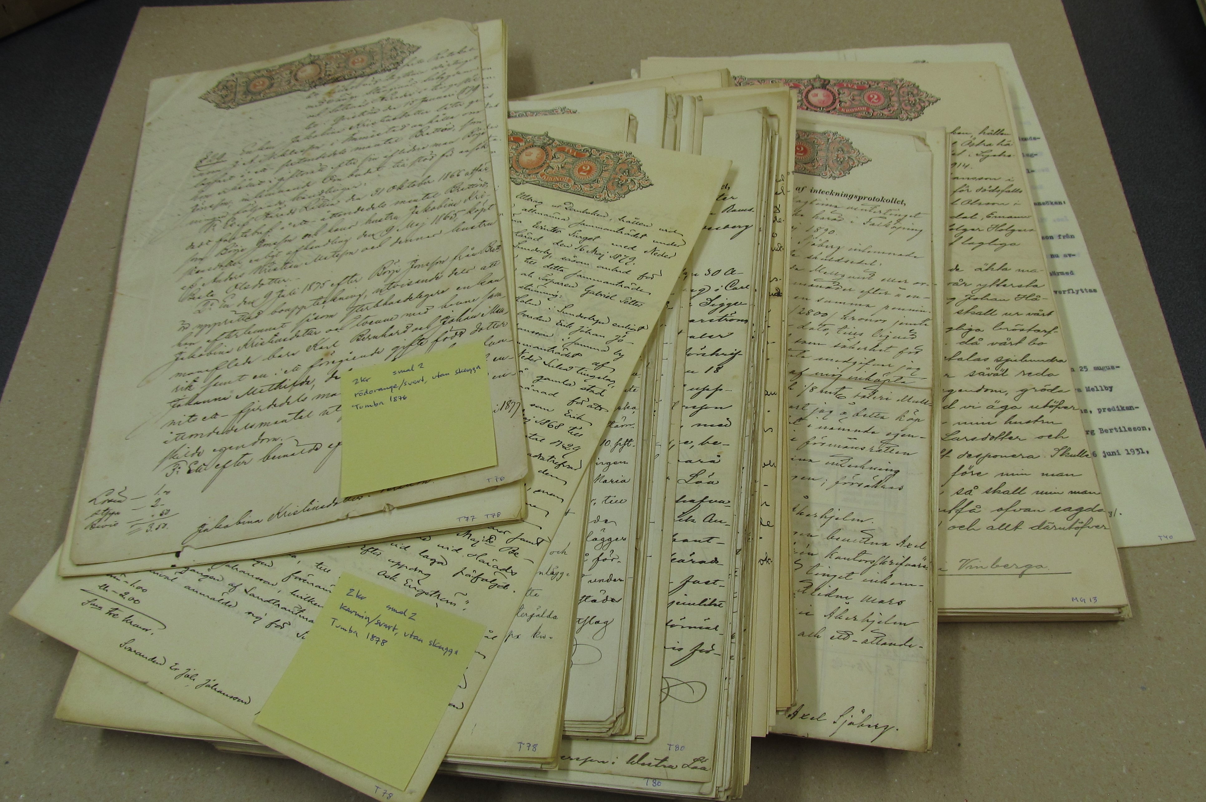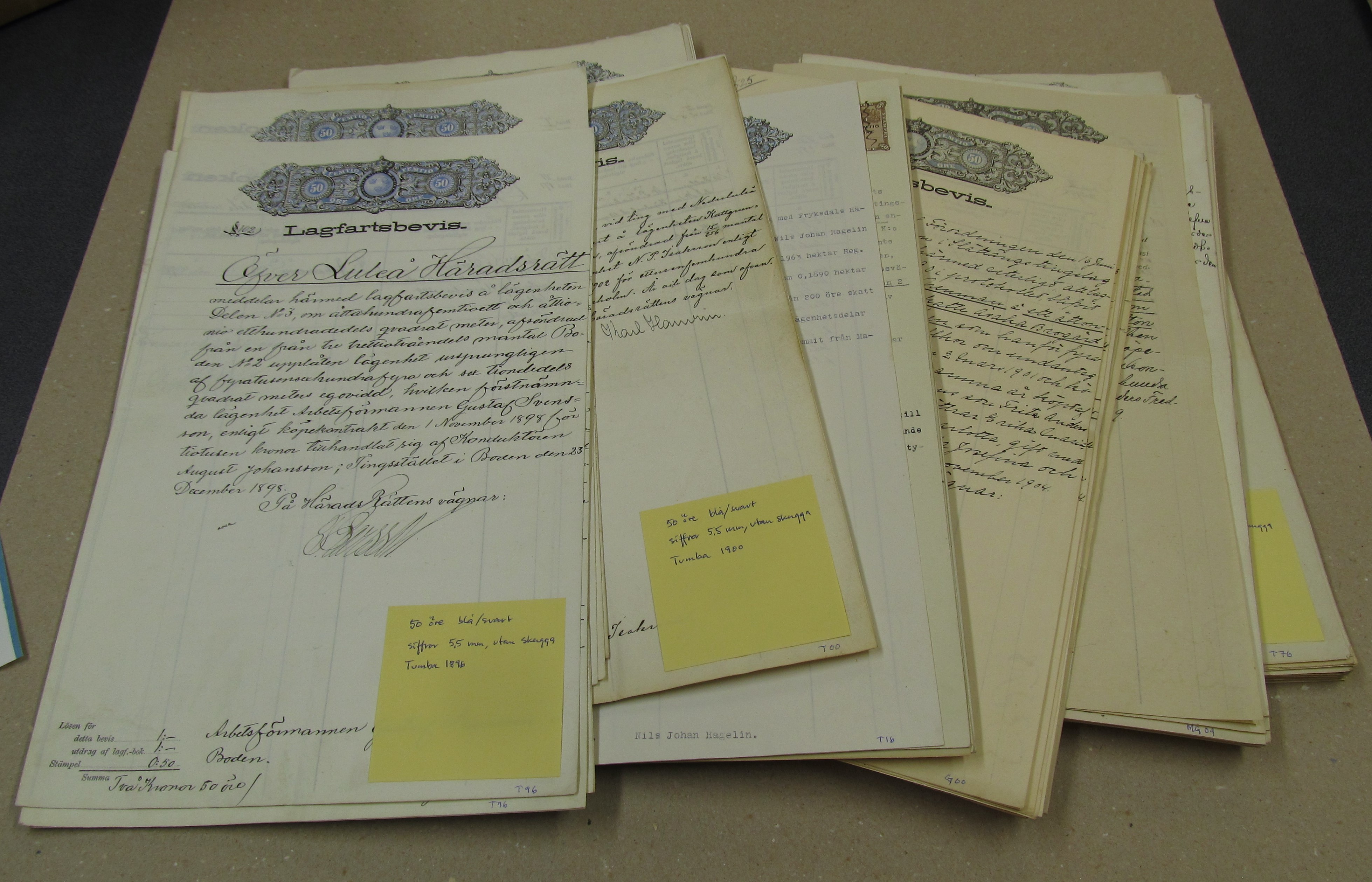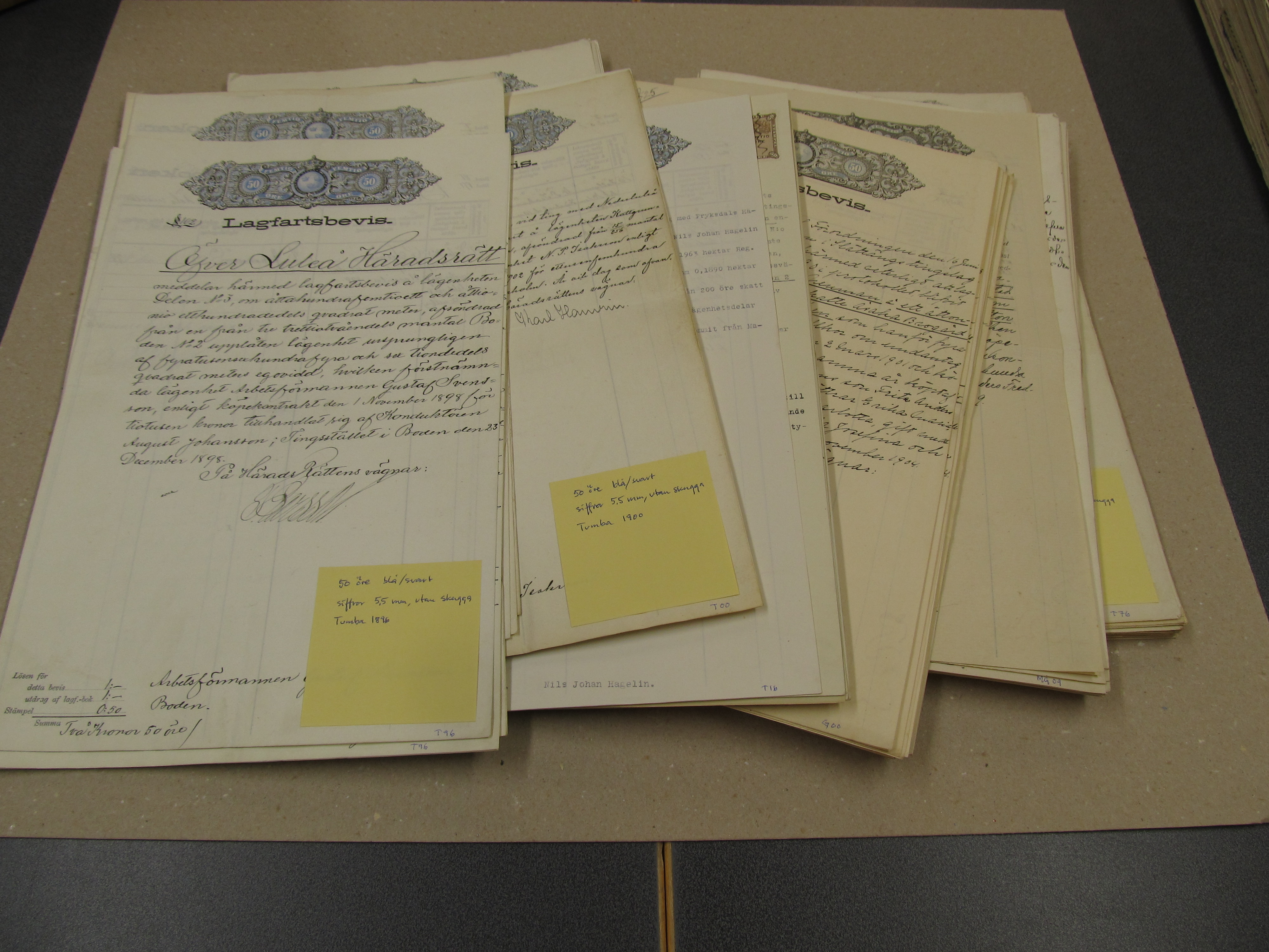 Sweden. Revenue stamped papers, collection/accumulation in box. An extensive and highly specialized compilation of revenue stamped papers from the seventh period (1858–1946). In total 495 documents (a bundle of 19 cm height!) with all denominations from the period, including the rare 75 öre and three 2 kr overprinted on 3 kr. Incl. different paper mills, a great number of different years in watermark, color shades, misprints, various printings, etc. A comprehensive and specialized collection almost impossible to obtain. Condition good to very fine. Some scans are presented at www.philea.se. Approx. 10 kg.