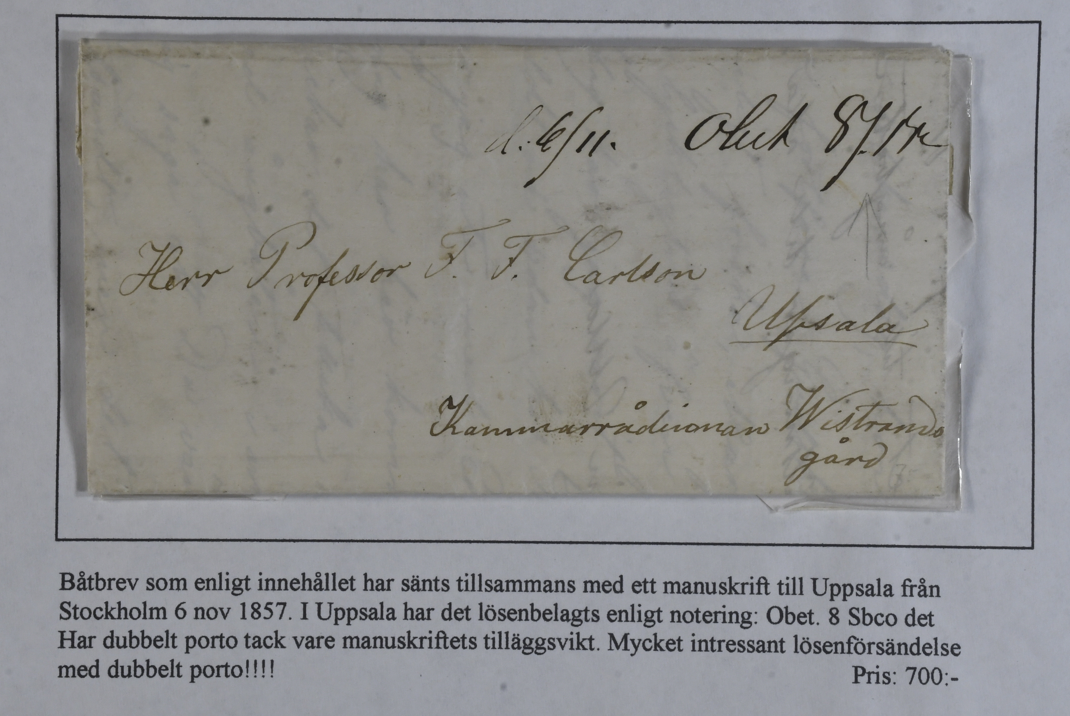 Sweden. Lösenförsändelser. Letter 'dated Stockholm den 5 Nov. 1857' sent unpaid together with a manuscript (according to content), hence taxed with double postage 'Obet 8/ bco.