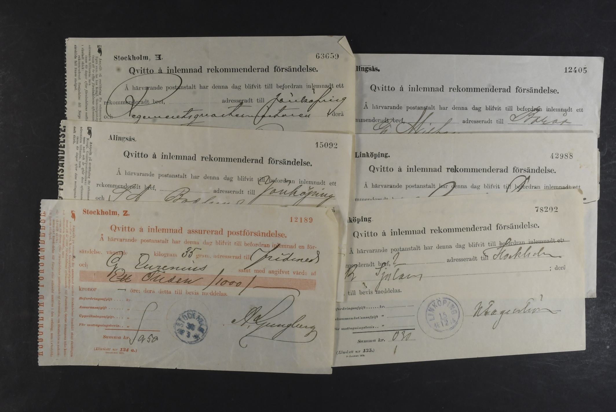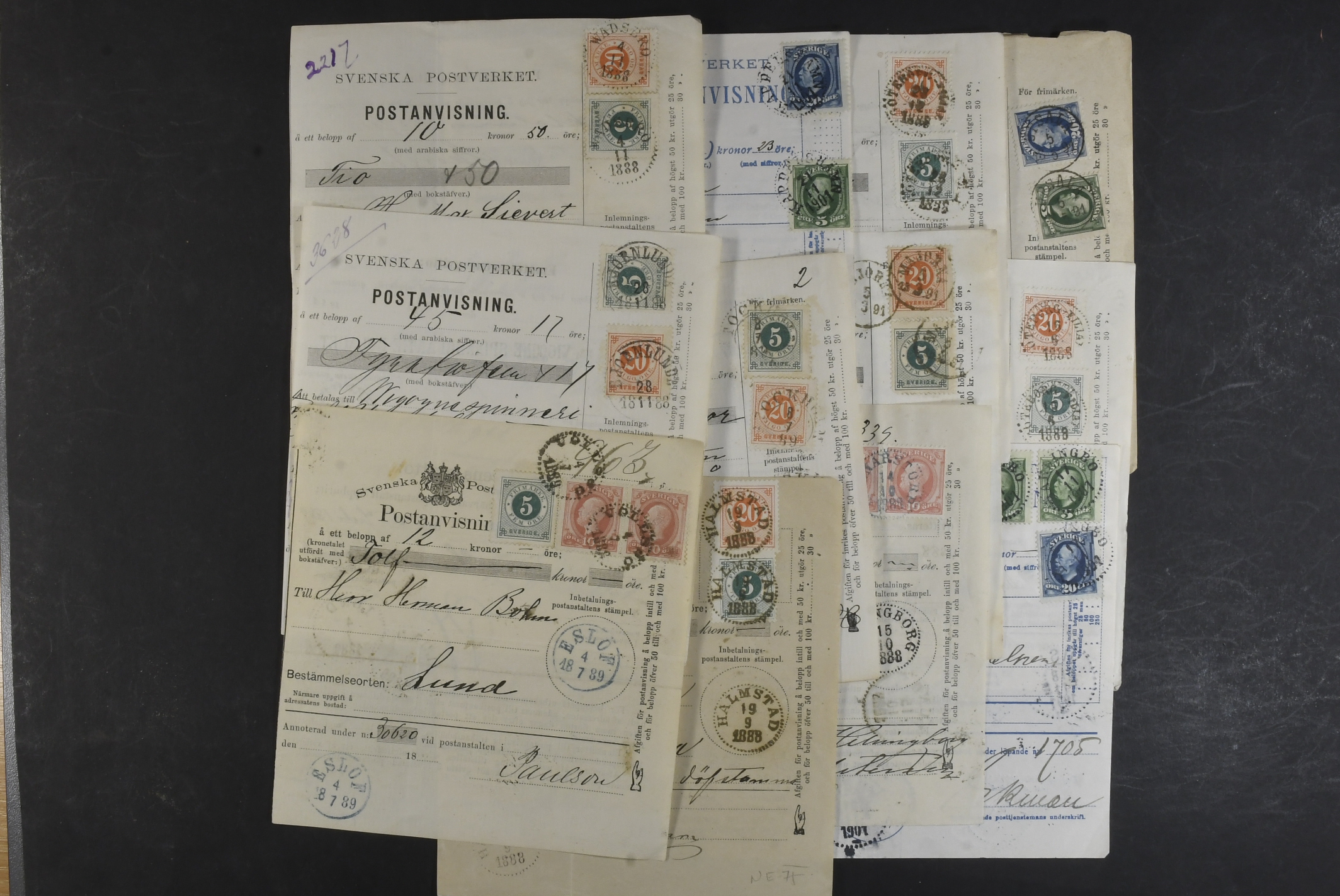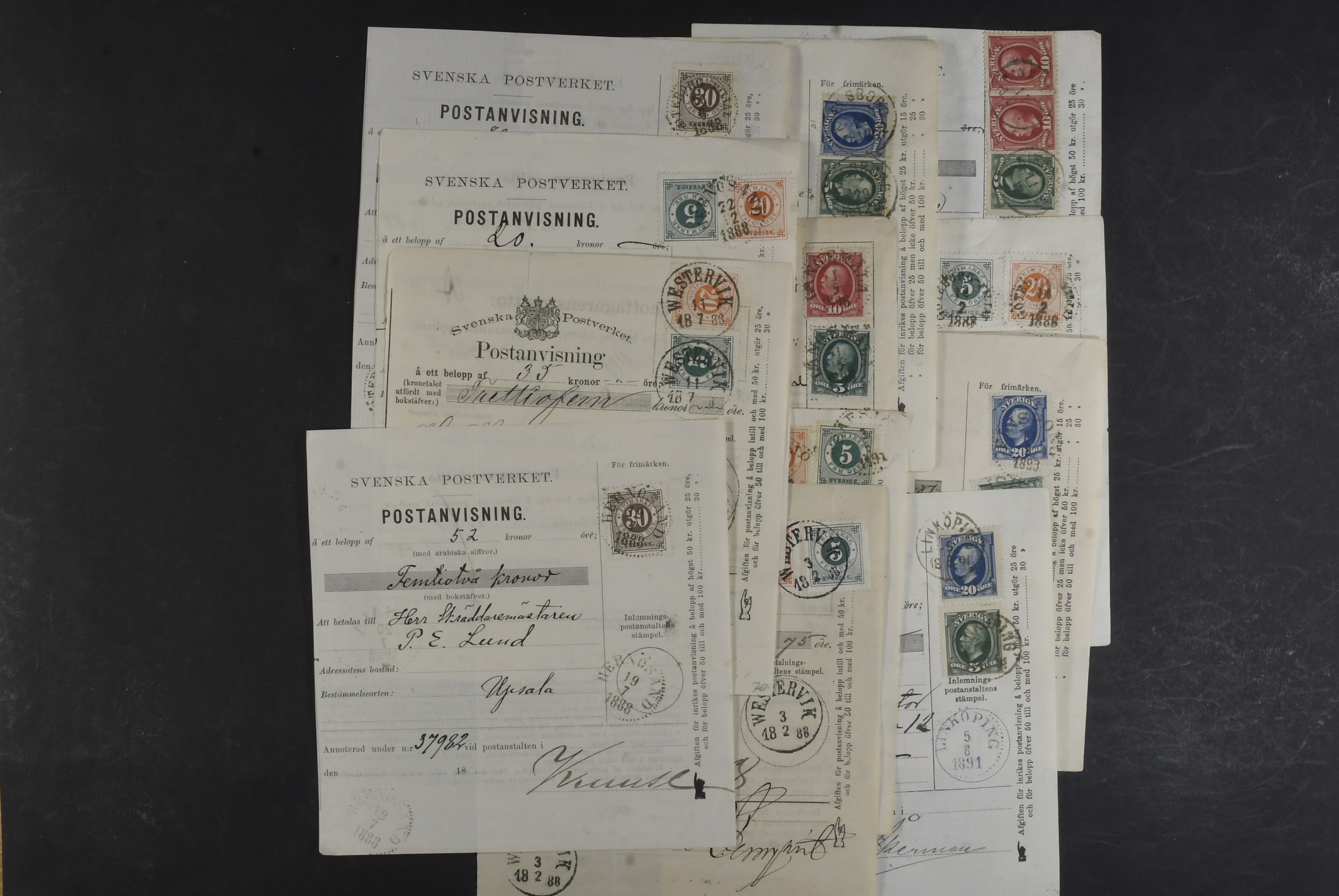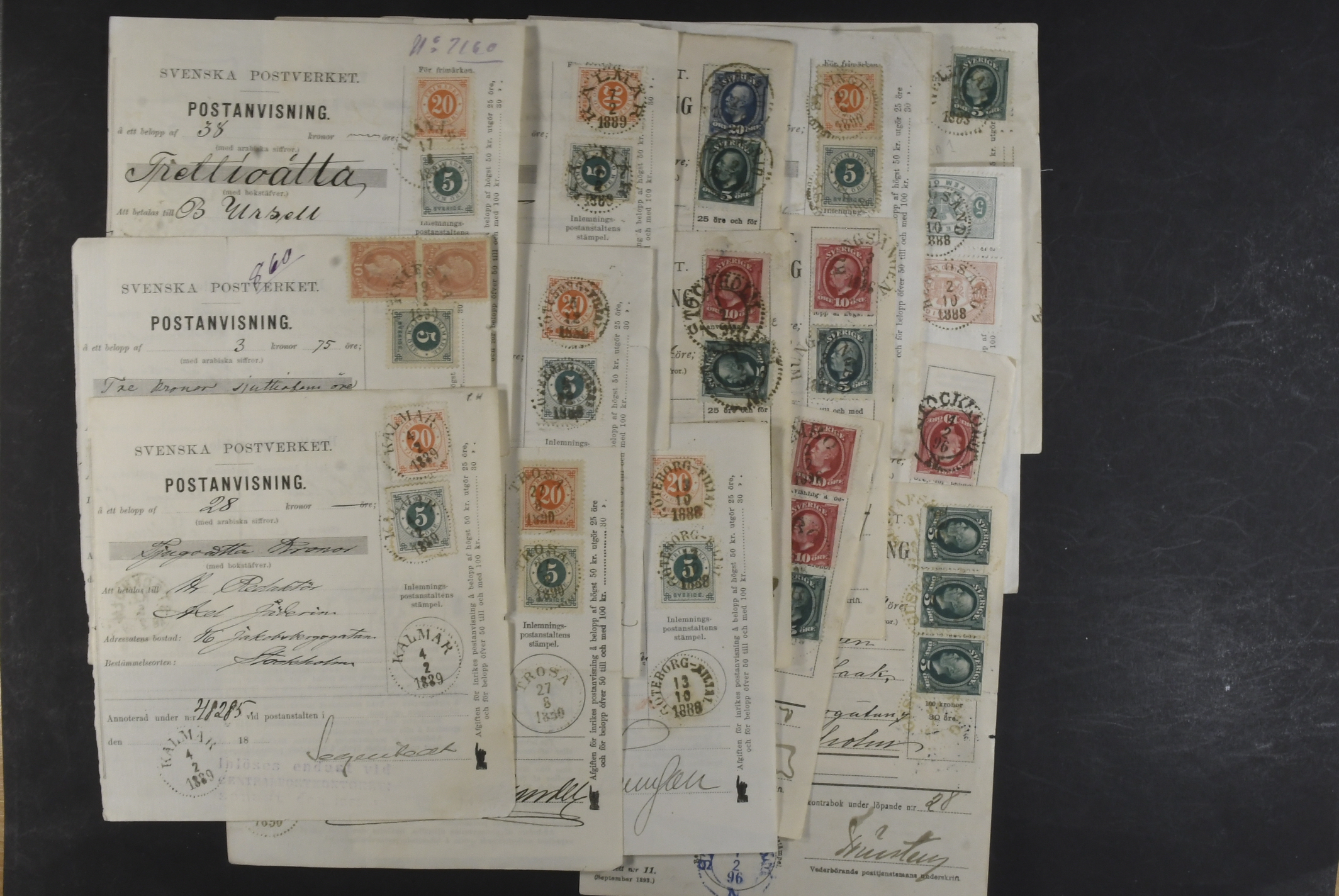 Sweden. Lot covers 1870s–1900s. Mostly money orders and receipts, most with coloured cancellations of different sort. (60)