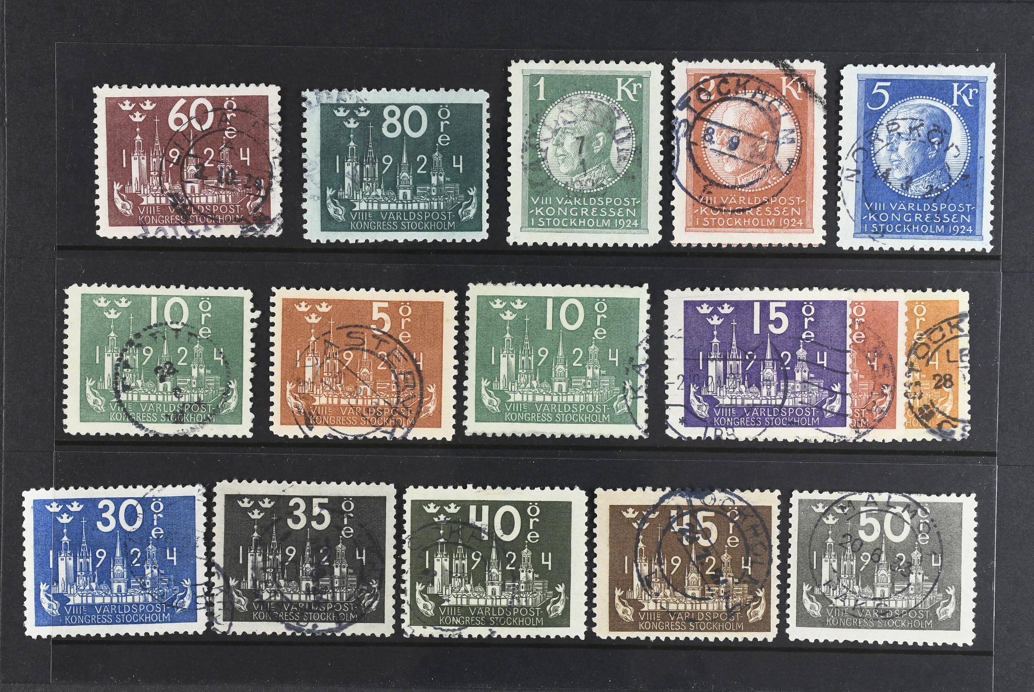 Sweden. Facit 196–210 used, SET (16) incl. 10 öre cx. Somewhat mixed quality, 15 with crease and 2 kr with short perfs. SEK 10000