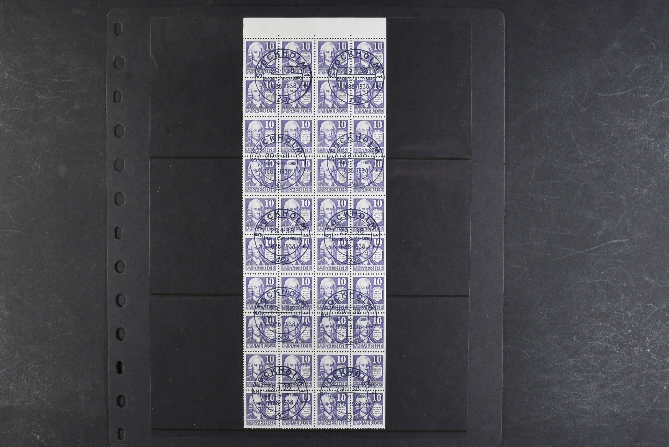 Sweden. Facit 259 used, Section of a stamp sheet with Swdenborg, 10 öre 40 stamps from the right side of the sheet, cancelled STOCKHOLM 29.1.1938. If separated it is possble to get 10 cancelled CB-pairs from the sheet. SEK 15