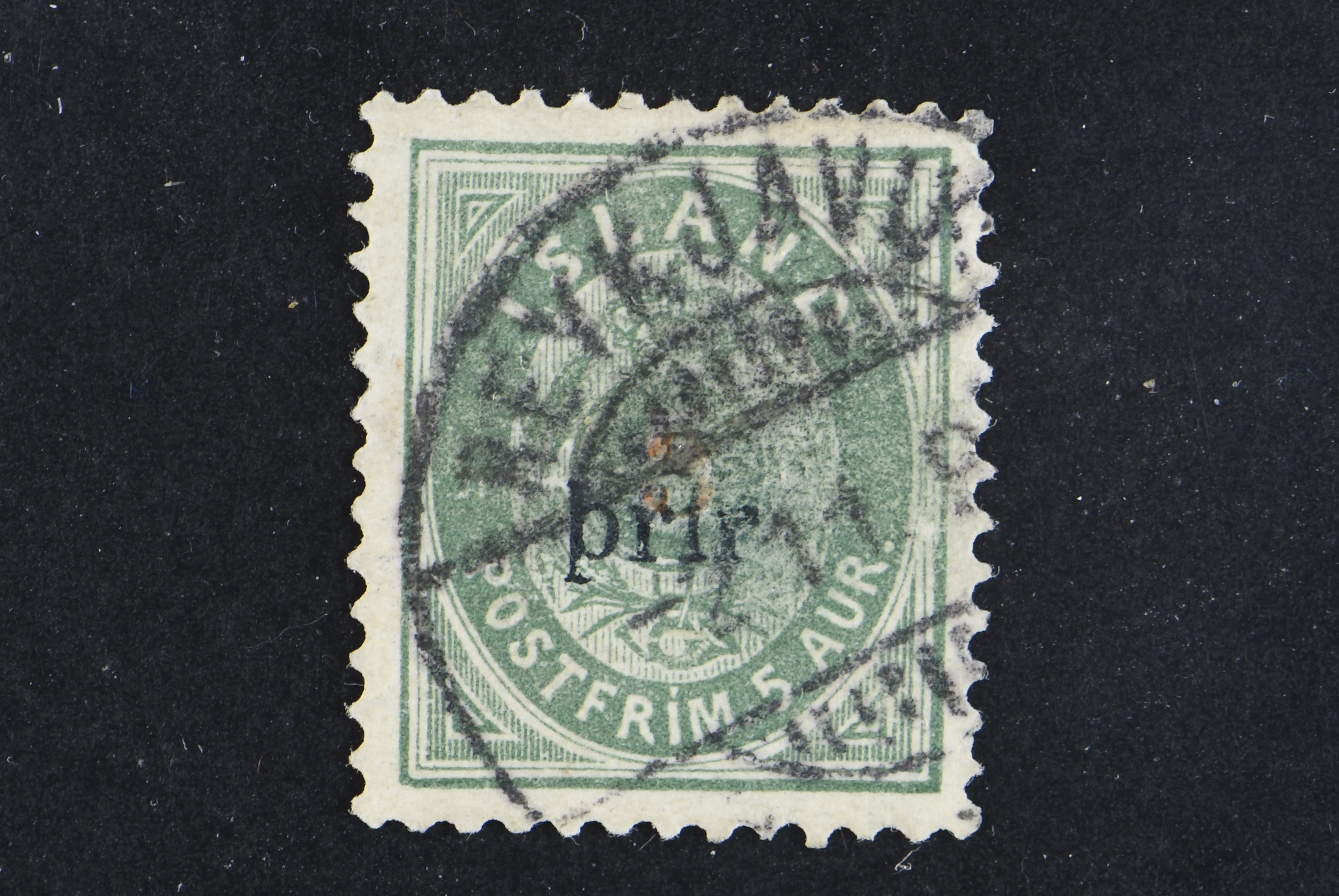 Iceland. Facit 35 used, 1897 “þrir” Surcharge 3 þrir large letters, perf 12¾. Singed Möller BPP (slightly high) very small perforation imperfections. SEK 6500