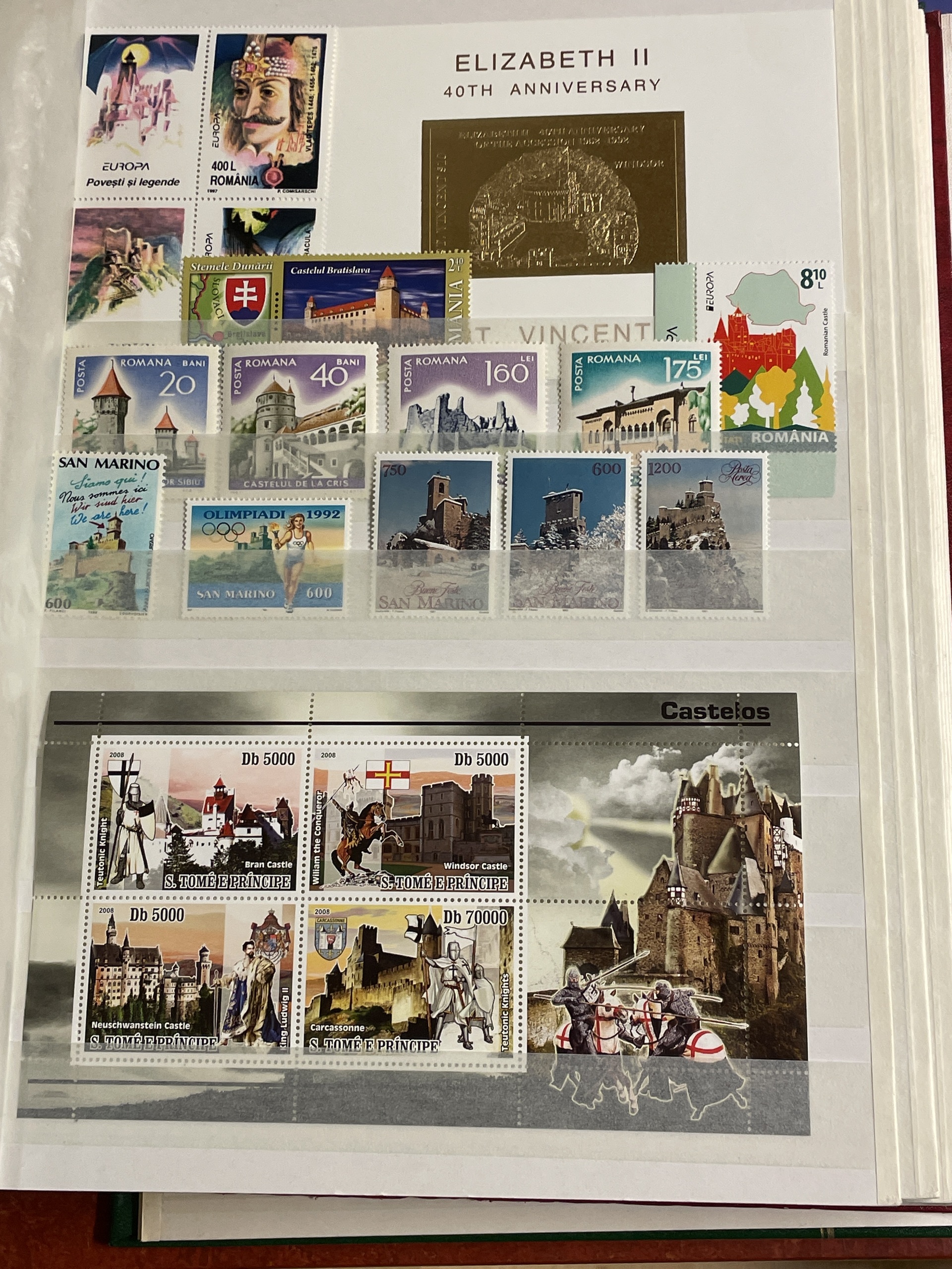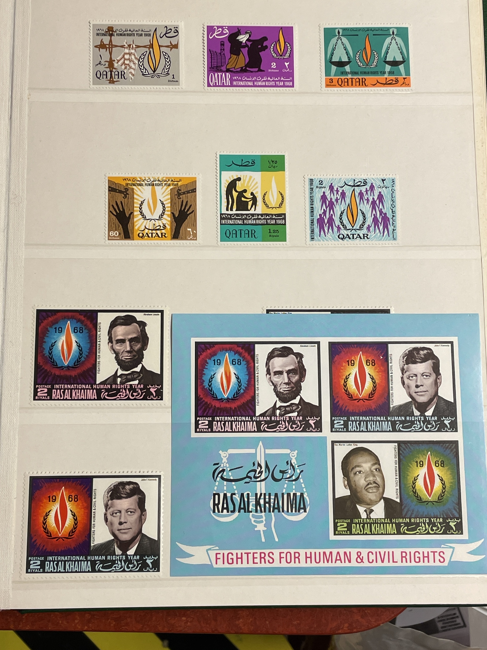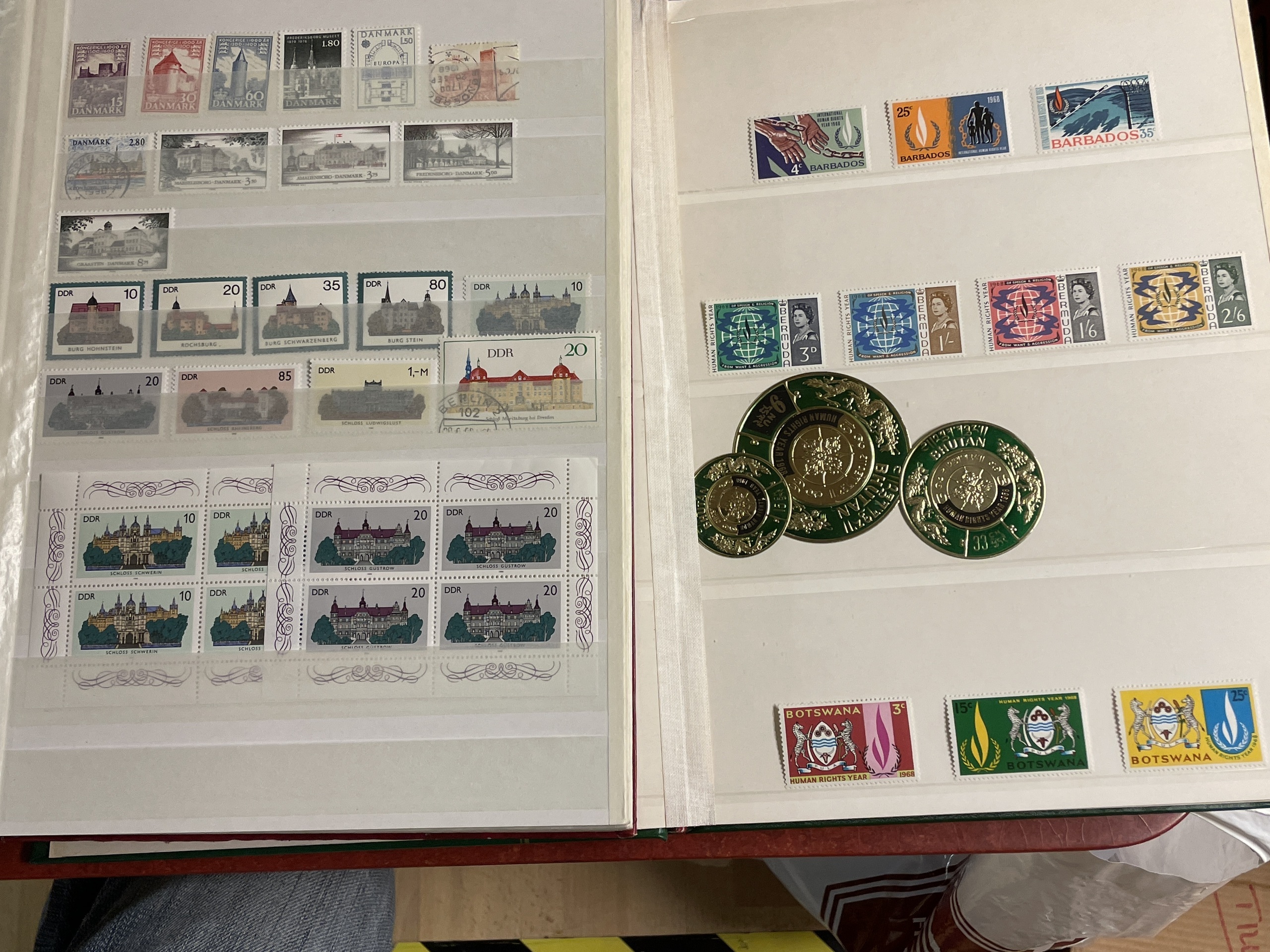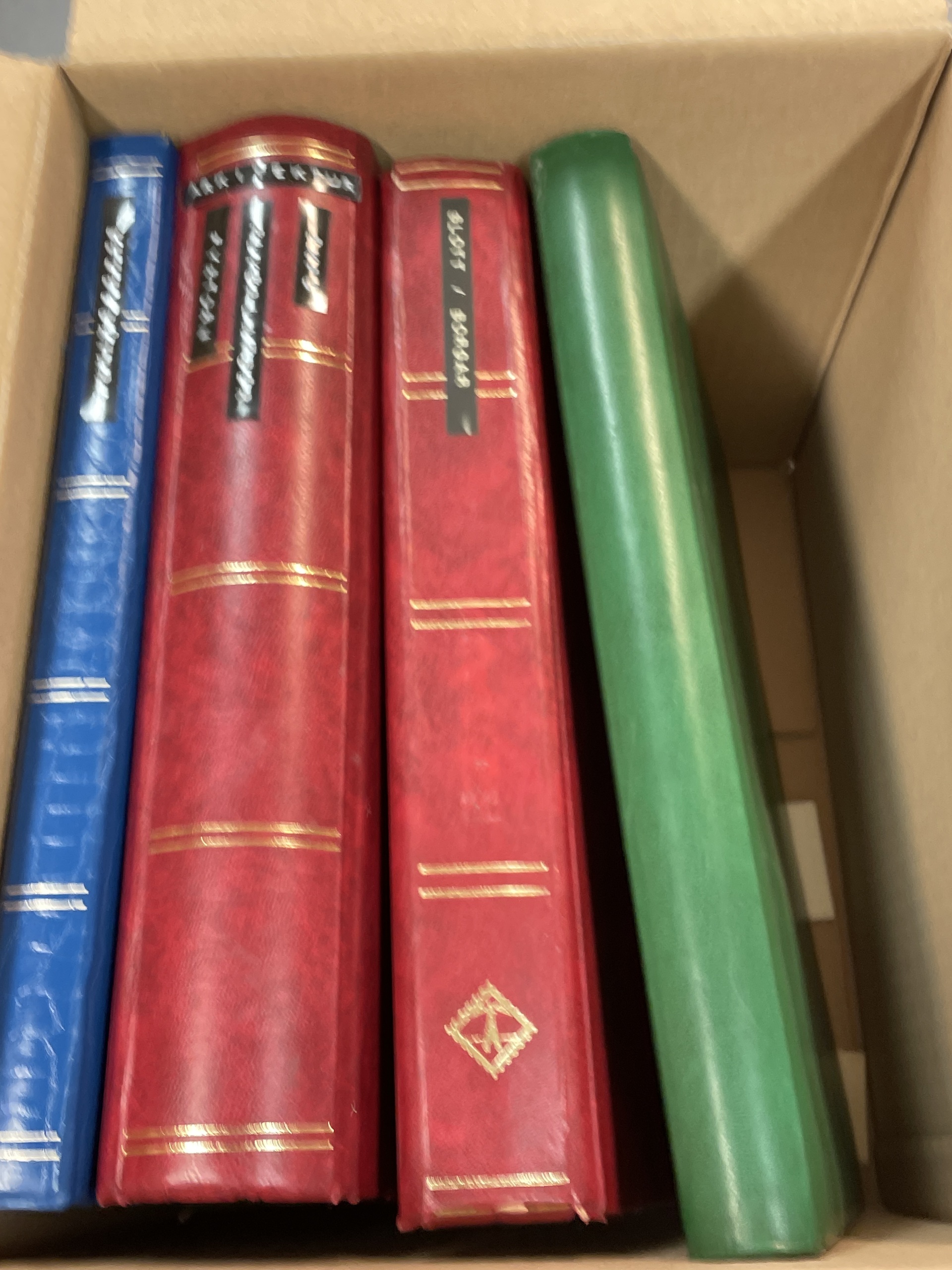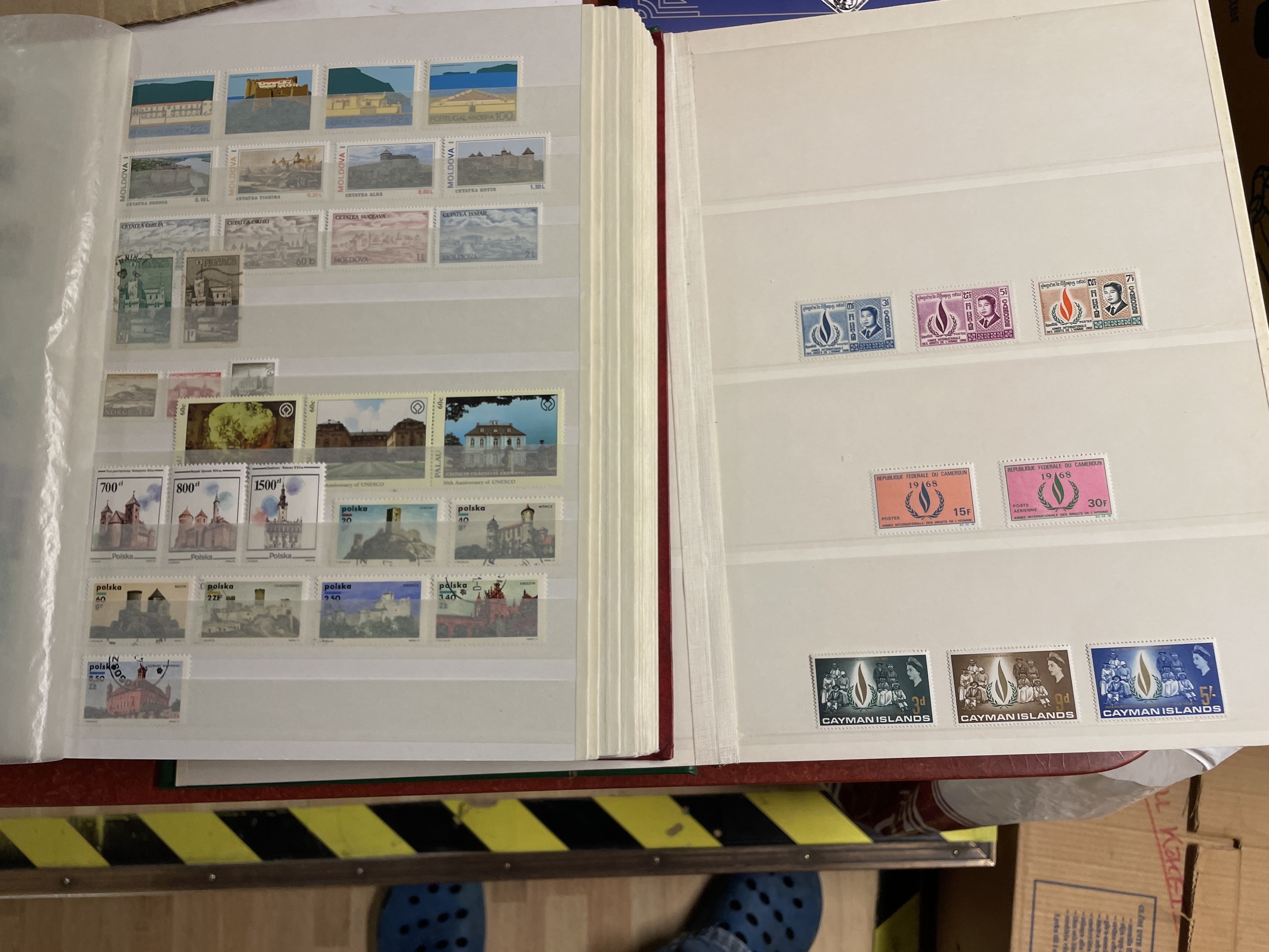 ALL WORLD. Collection ★★ 1950s–ca. 2000 in box. Four stockbooks with thematic stamps incl. castles, airports, lighthouses, ships and human right year 1968 incl. some better sets. Please see a selection of scans at www.philea.se. Fine quality. Approx. 6 kg. (1000+)