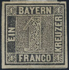 Germany, Bavaria. Michel 1 I ★, 1849, 1 Kreuzer Grey-black, mint hinged, repaired upper right corner.
