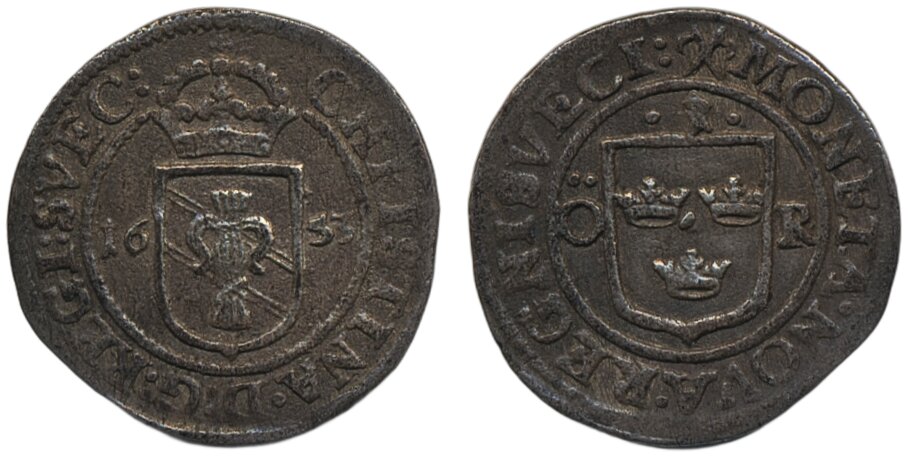 Coins, Sweden. Kristina, SM 90a, 1 öre 1653. 1.06 g. Stockholm. Legend D.G.REGI.SVEC: with large C in SVEC. 1+.