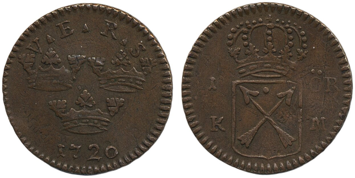Coins, Sweden. Ulrika Eleonora, SM 26a, 1 öre KM 1720. 4.86 g. Stockholm. 1+.