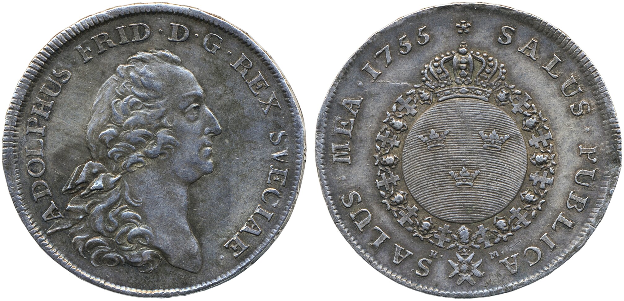 Coins, Sweden. Adolf Fredrik, SM 45b, 1 riksdaler 1755. 29.22 g. Stockholm. Ex. Künker auction 261 lot 5898. 1+/01.