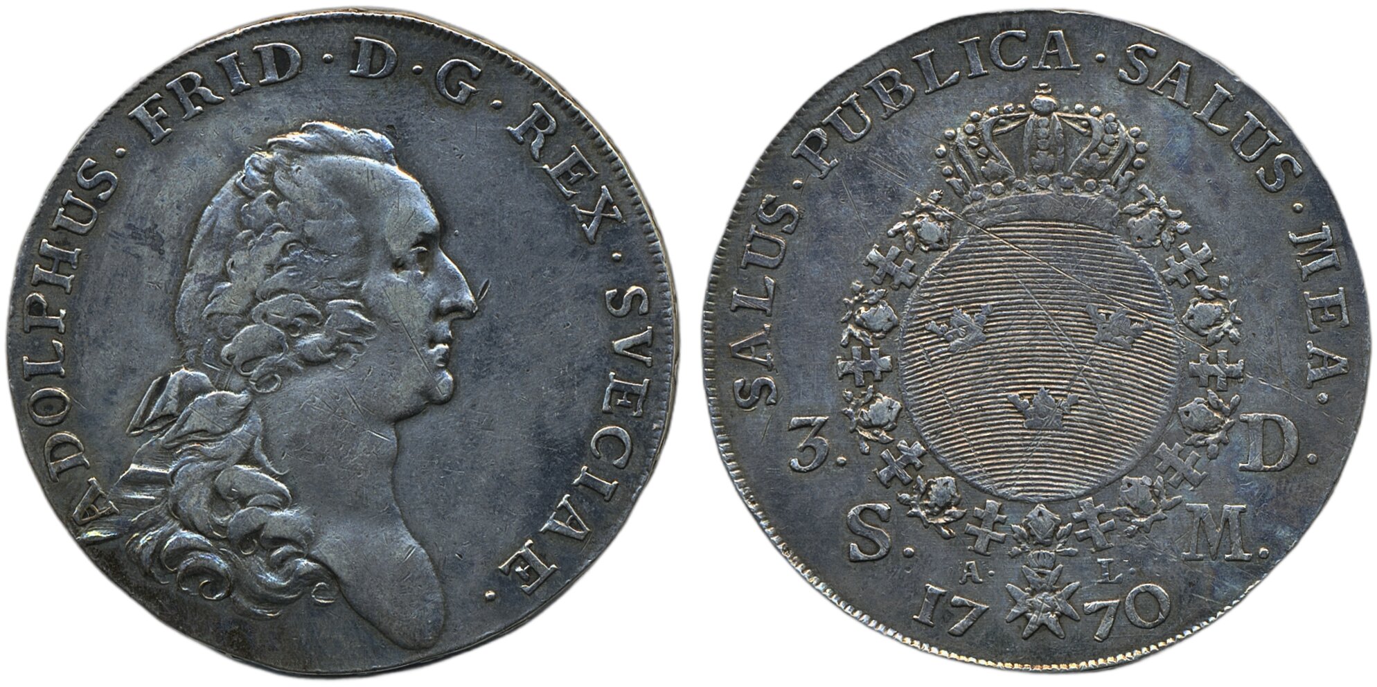 Coins, Sweden. Adolf Fredrik, SM 59b, 3 daler SM 1770. 29.22 g. Stockholm. Scratches, pecks, cleaned. 1/1+.