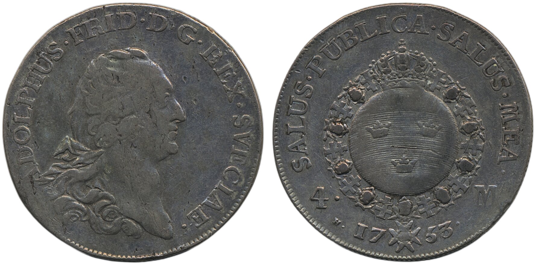 Coins, Sweden. Adolf Fredrik, SM 82b, 4 mark 1753. 21.07 g. Stockholm. Pecks, scratch. 1.