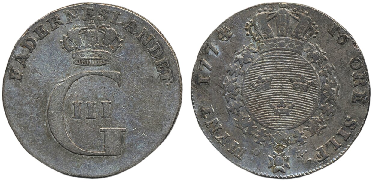 Coins, Sweden. Gustav III, SM 75, 16 öre (1/6 riksdaler) 1774/3. 6.11 g. Stockholm. 1?