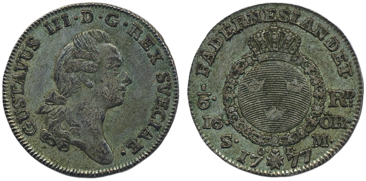 Coins, Sweden. Gustav III, SM 77, 1/6 riksdaler 1777. 6.20 g. Stockholm. 1/1+.
