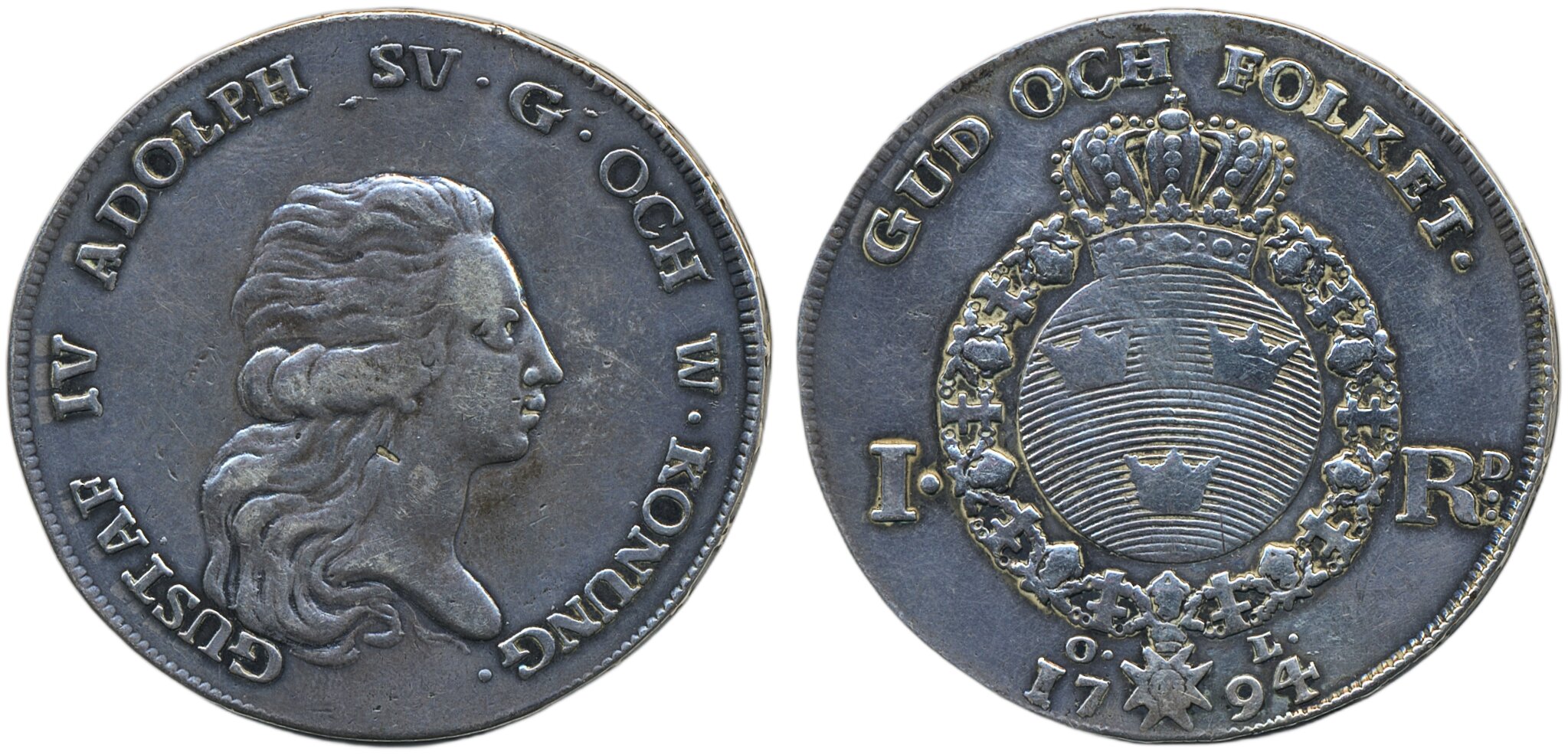 Coins, Sweden. Gustav IV Adolf, SM 23a, 1 riksdaler 1794. 29.00 g. Stockholm. Reverse polished. 1/1+.