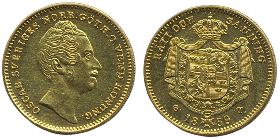 Coins, Sweden. Oskar I, SM 23, 1 dukat 1859. 3.47 g gold. 1+.