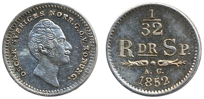 Coins, Sweden. Oskar I, SM 53, 1/32 riksdaler specie 1852. 01/0.