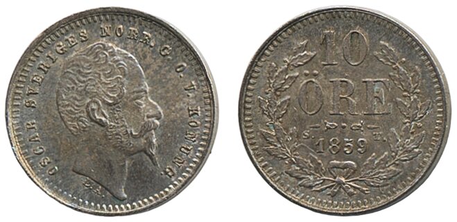 Coins, Sweden. Oskar I, SM 70, 10 öre 1859. 01/0.