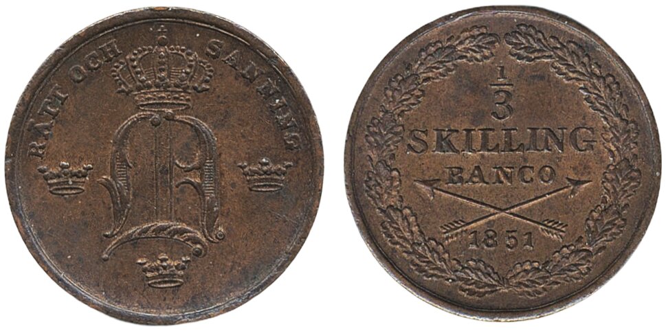Coins, Sweden. Oskar I, SM 116, 1/3 skilling banco 1851. Good 01.