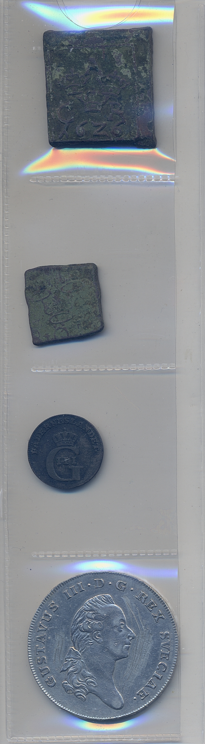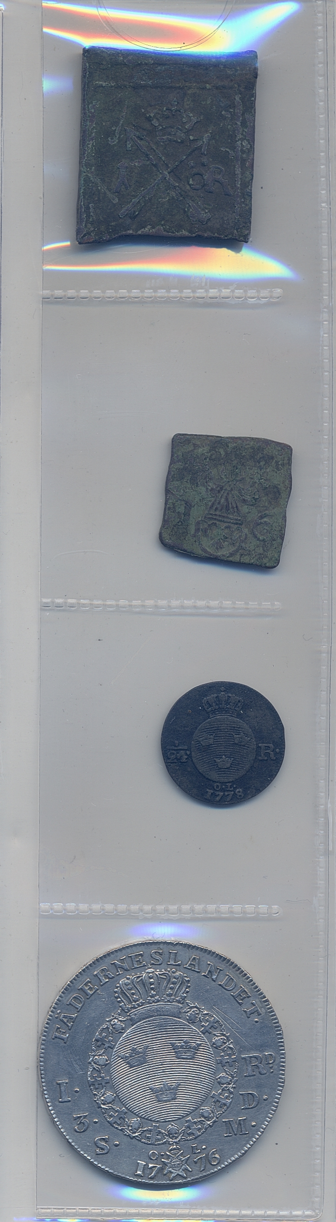 Coins, Sweden. Small lot of four Swedish coins including scratched/tooled Riksdaler 1776, corroded 1 öre 1626 and 8 öre 1591. Please inspect! 1?-1+.