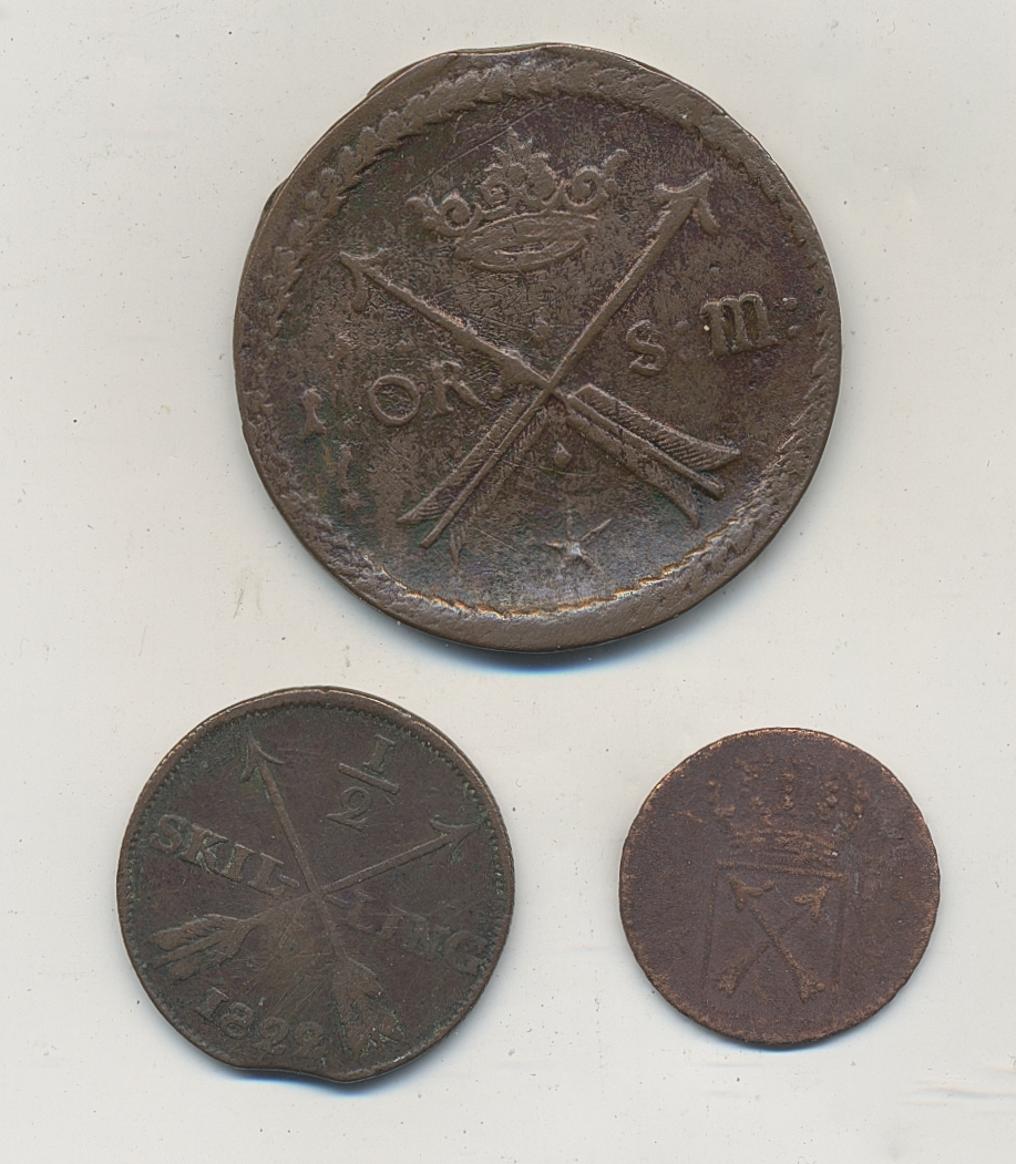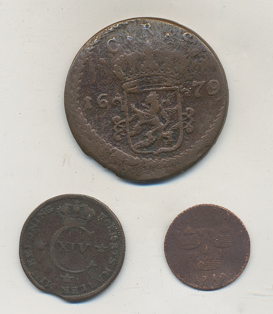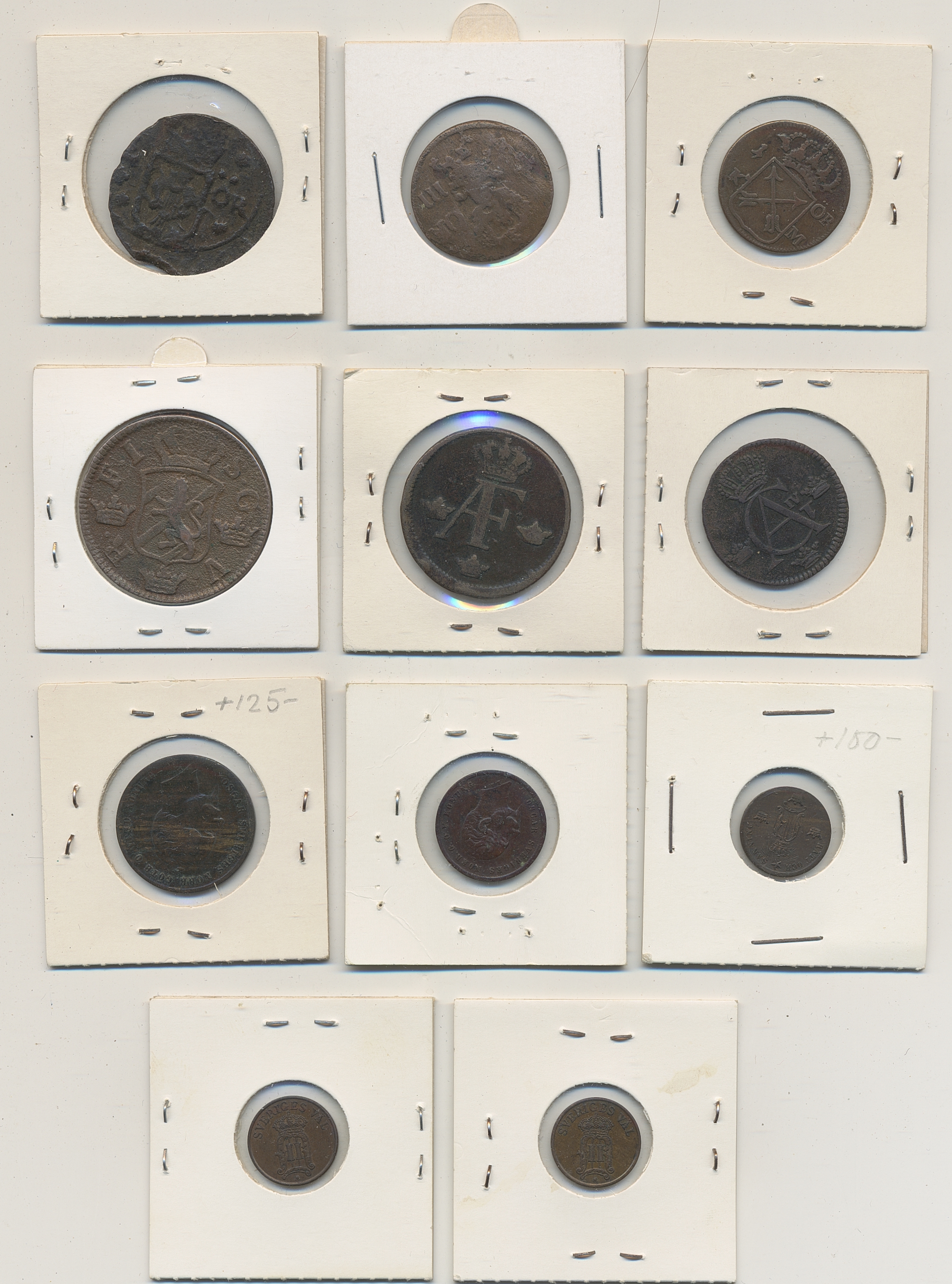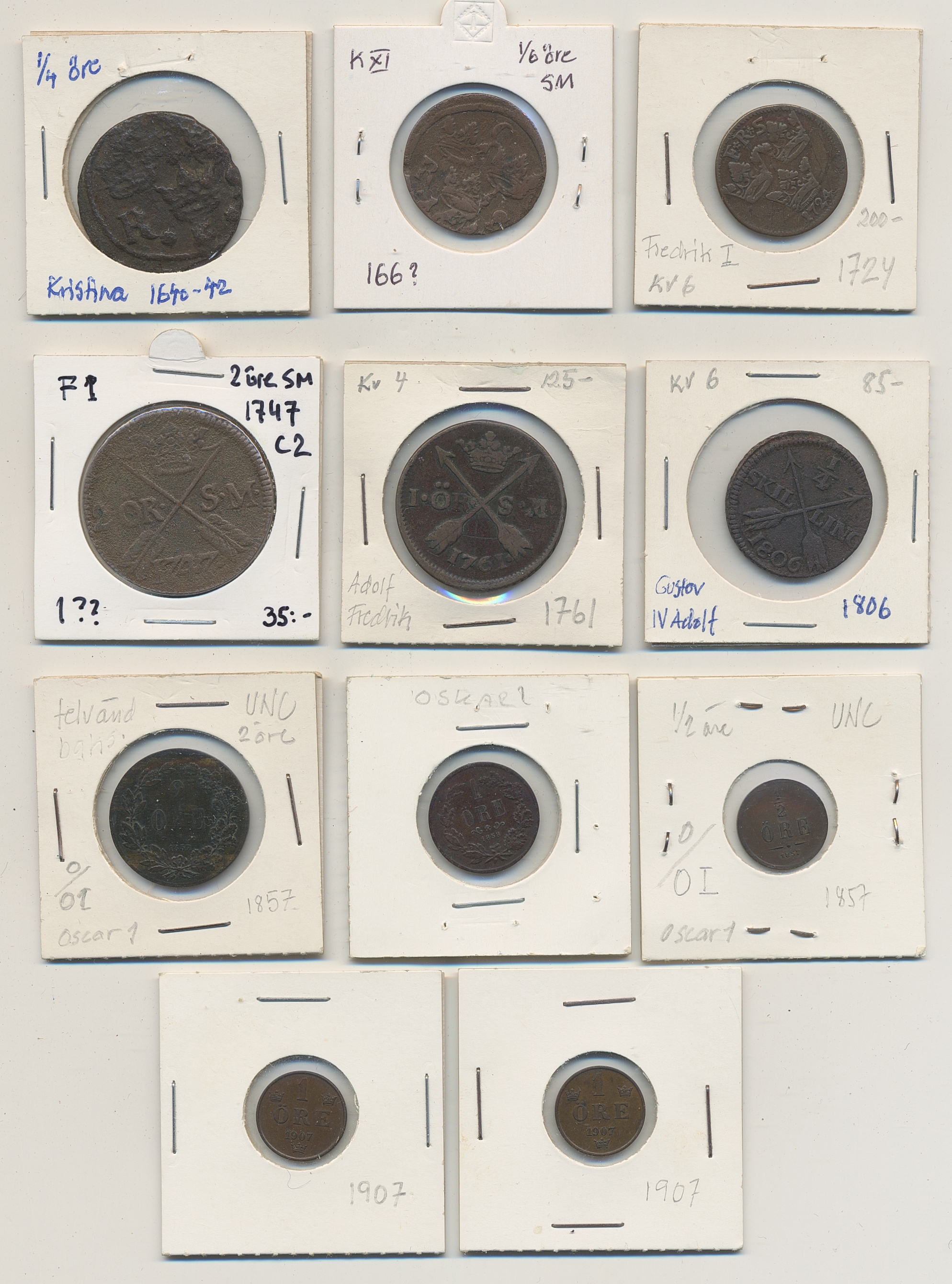 Coins, Sweden. Box with 14 bronze coins, 1640s–1907, mixed quality.
