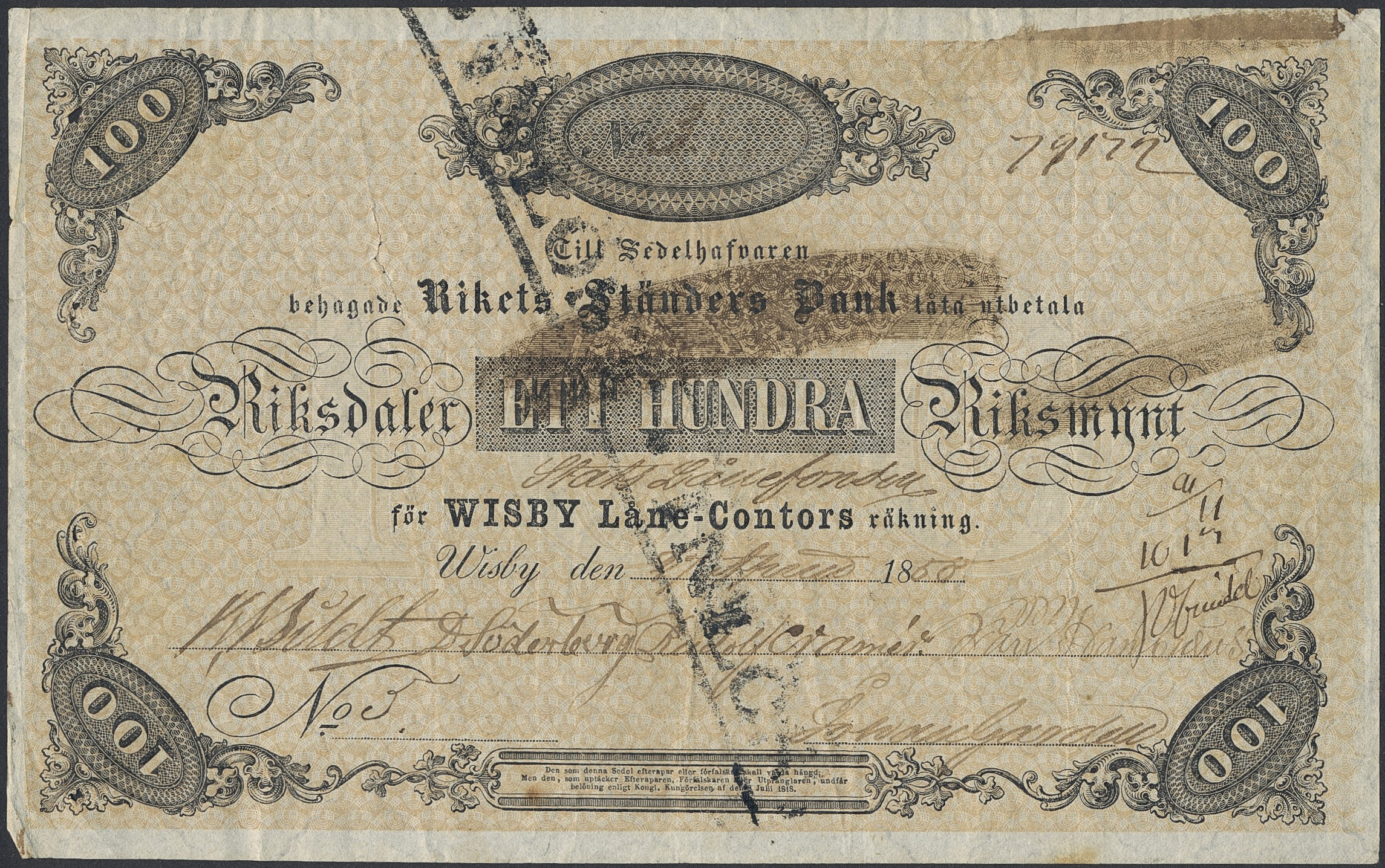 Banknotes, Sweden. 100 riksdaler riksmynt 1858. No: 3, 79172. Rikets Ständers Bank låta utbetala 100 riksdaler Riksmynt för Wisby Låne-Contors räkning. 1?