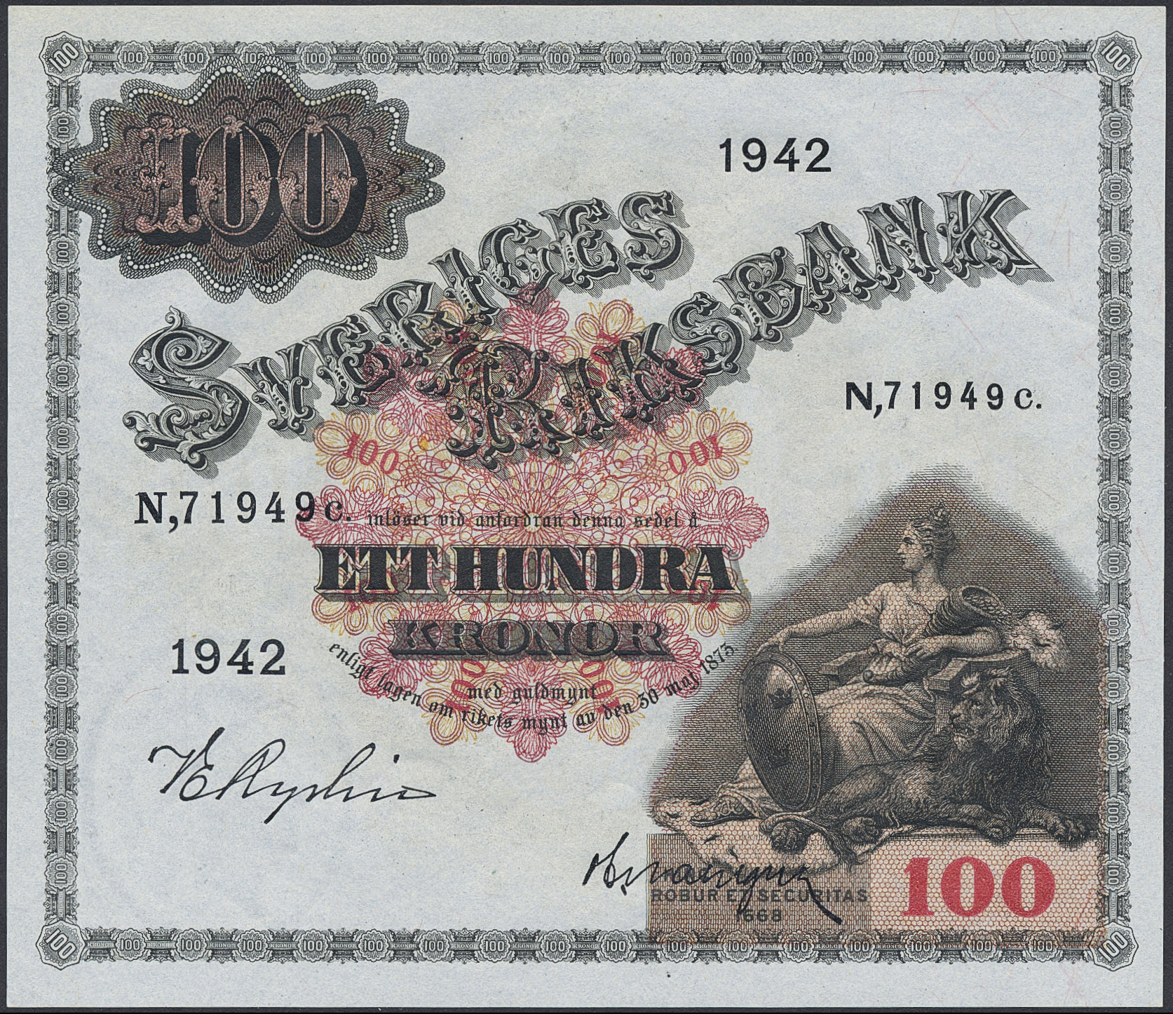Banknotes, Sweden. SF U8:25, 100 kronor 1942. N71949c. Not folded. Minor handling marks, beautiful embossing of this early date. 01/0.