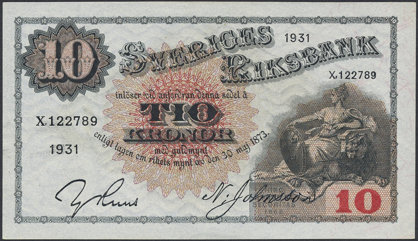 Banknotes, Sweden. SF R5:14, 10 kronor 1931. X122789. Crisp note with minor handling marks. 01/0.