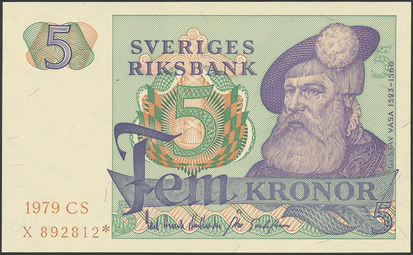 Banknotes, Sweden. SF Q11:20, 5 kronor 1979. X892812*. Replacement note. Not folded. Scarce note with only 8000 printed. 0.