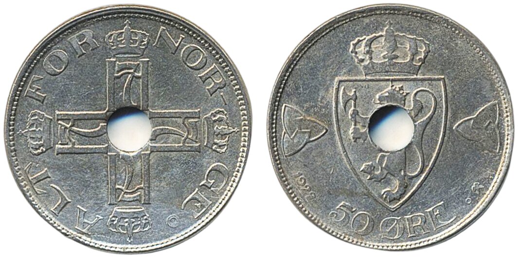 Coins, Norway. Haakon VII, NM 54, 50 øre 1922. With hole. Lightly cleaned. 01.