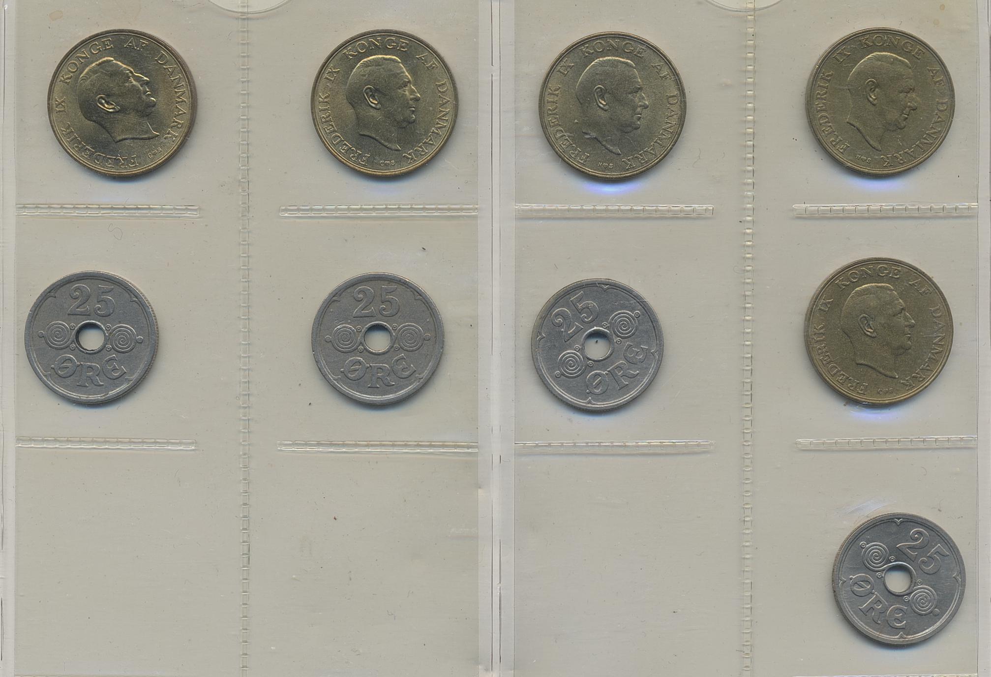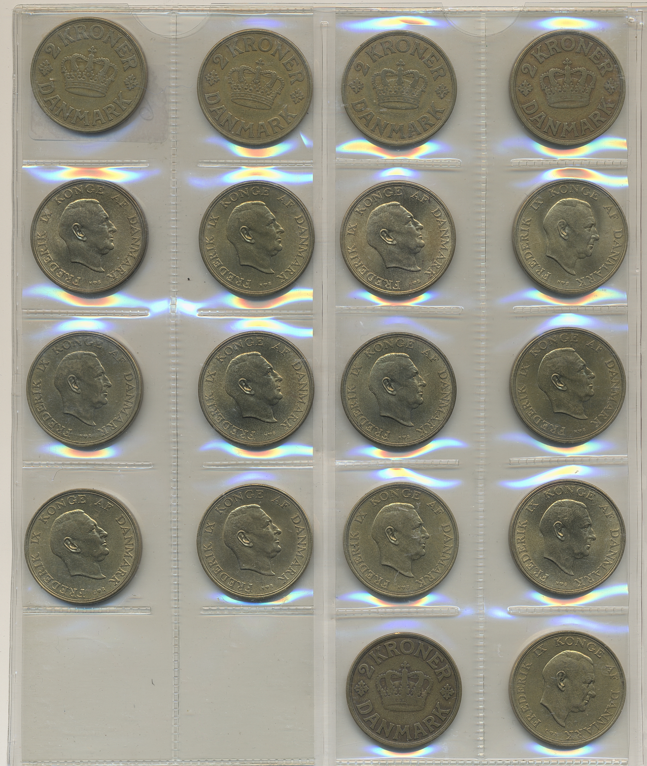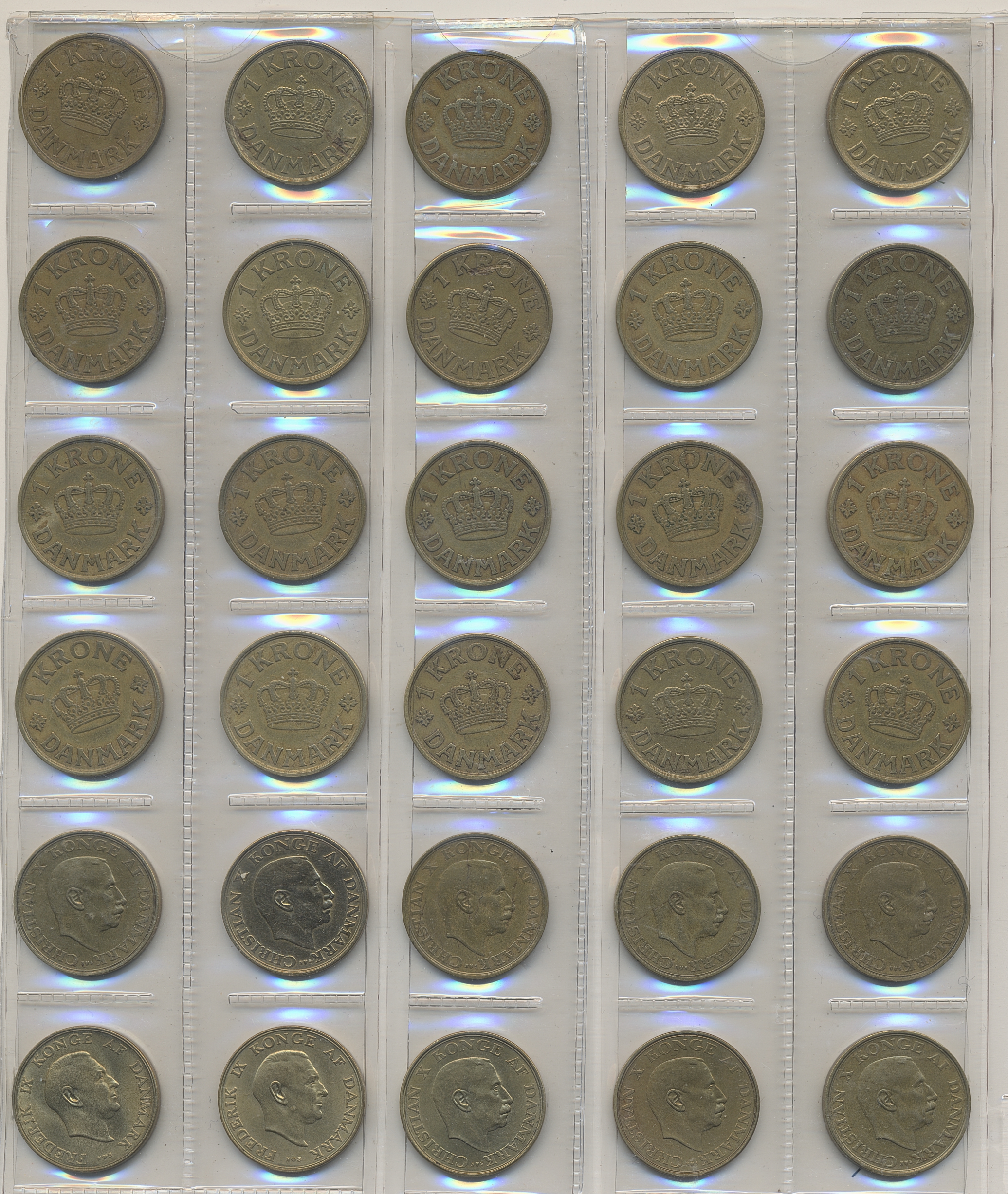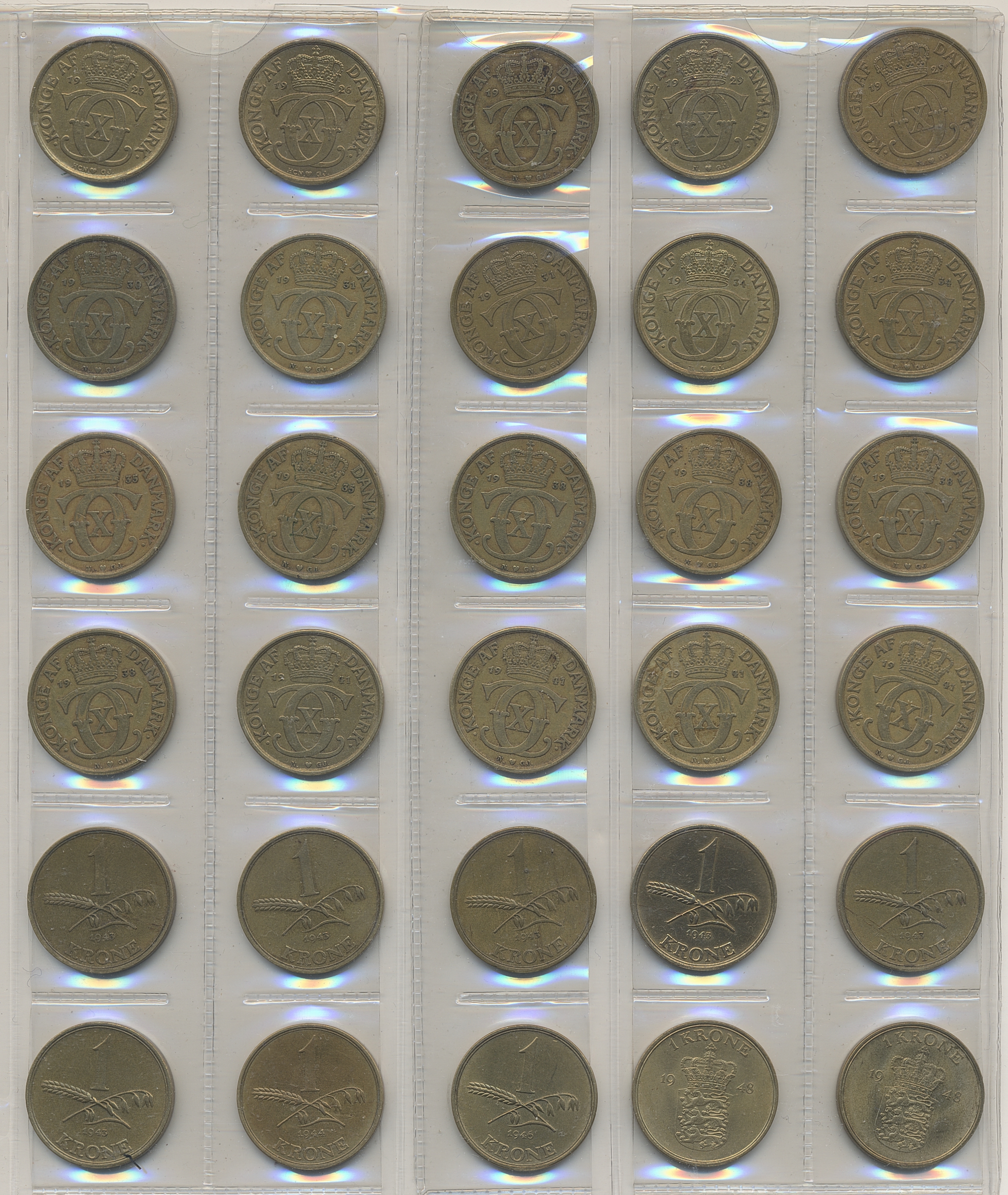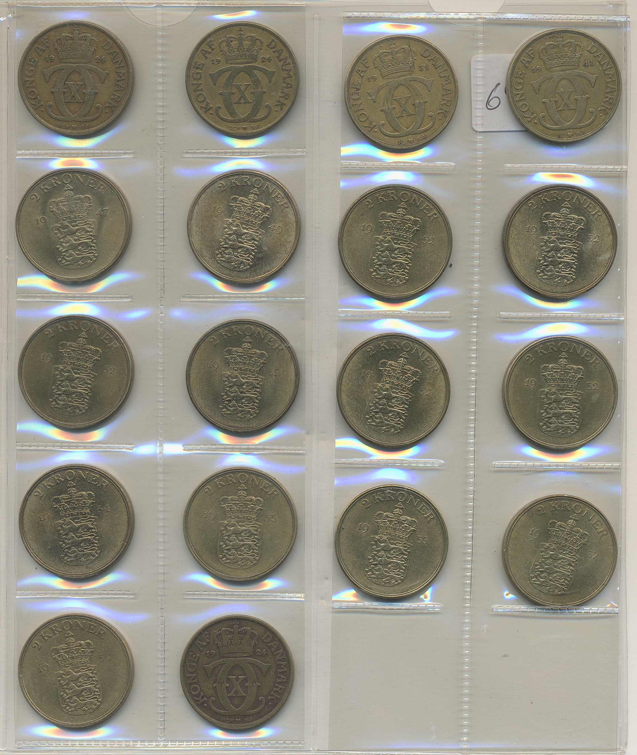 Coins, Denmark. Group of 57 coins mostly brass 1 krone and 2 kroner coins from early 1900s including 3 pcs 2 kr 1924 and other better dates. Please inspect! 1-01/0.