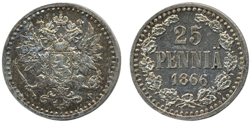 Coins, Finland. Alexander II, KM 6.1, 25 penniä 1866. Bitkin 642. 1+/01.