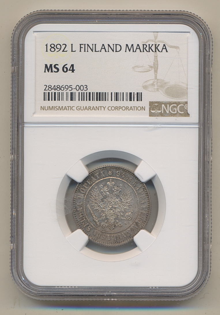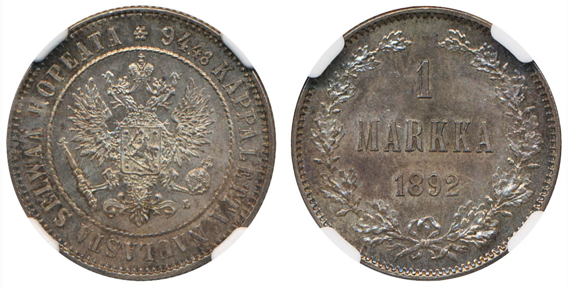 Coins, Finland. Alexander III, KM 3.2, 1 markka 1892. Graded by NGC as MS64. Bitkin 231. 01/0. See certification at NGC